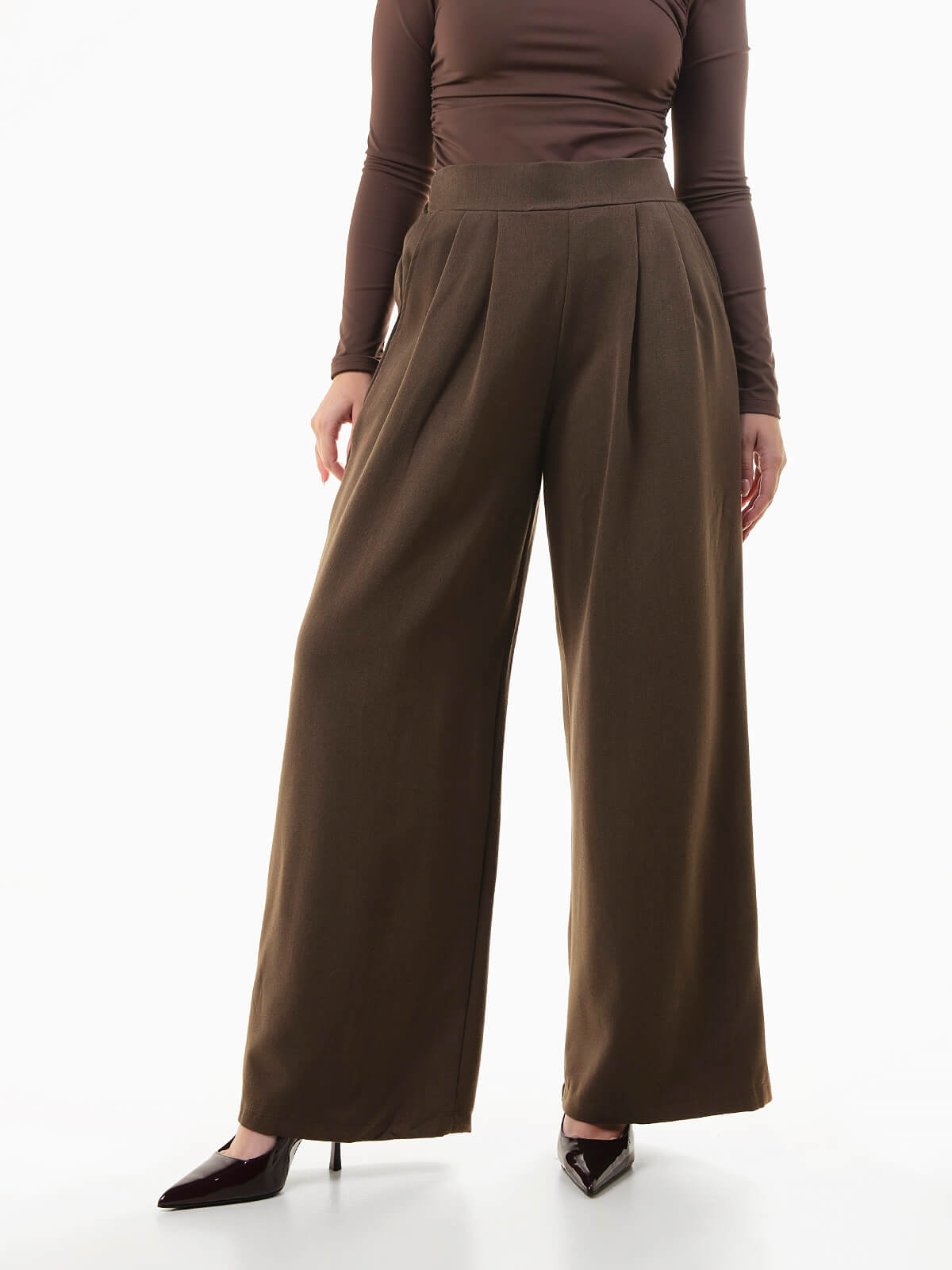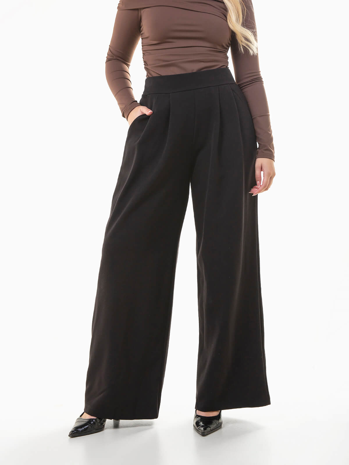 Calças fluídas de alfaiataria com pregas, cintura alta elástica na parte posterior e dois bolsos. Confortáveis e elegantes, perfeitas para looks modernos e versáteis.