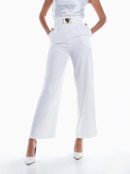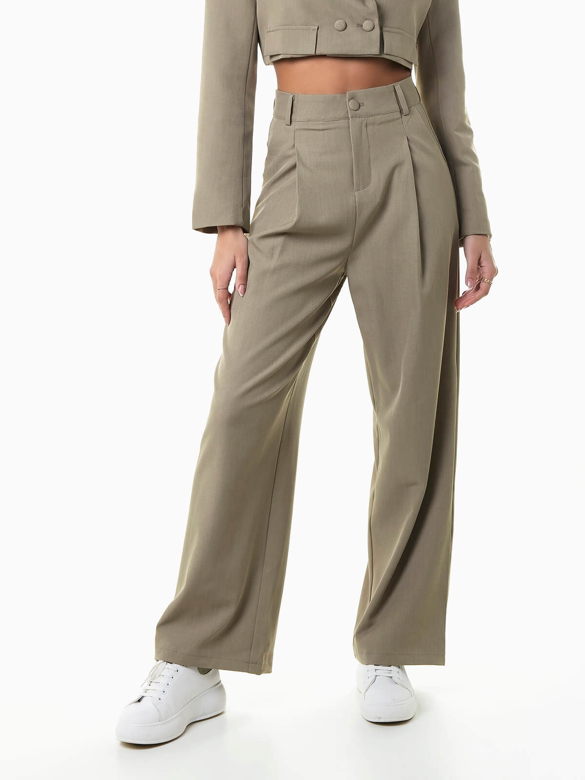 Calças fluídas com pormenor de pregas. Calças clássicas e elegantes de cintura alta com 2 bolsos laterais. Aperto de botão e fecho éclair.