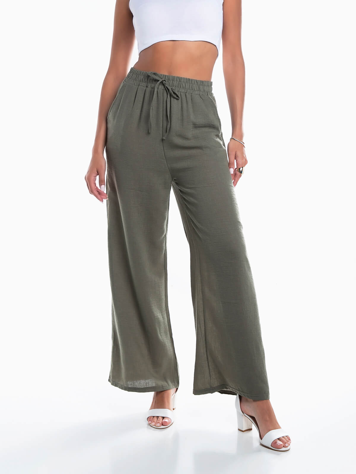 Calças fluídas em tecido com textura para senhora. Calças de cintura alta elástica. Cordão para laço. 2 bolsos.