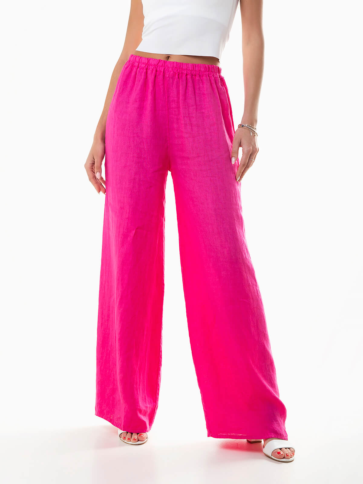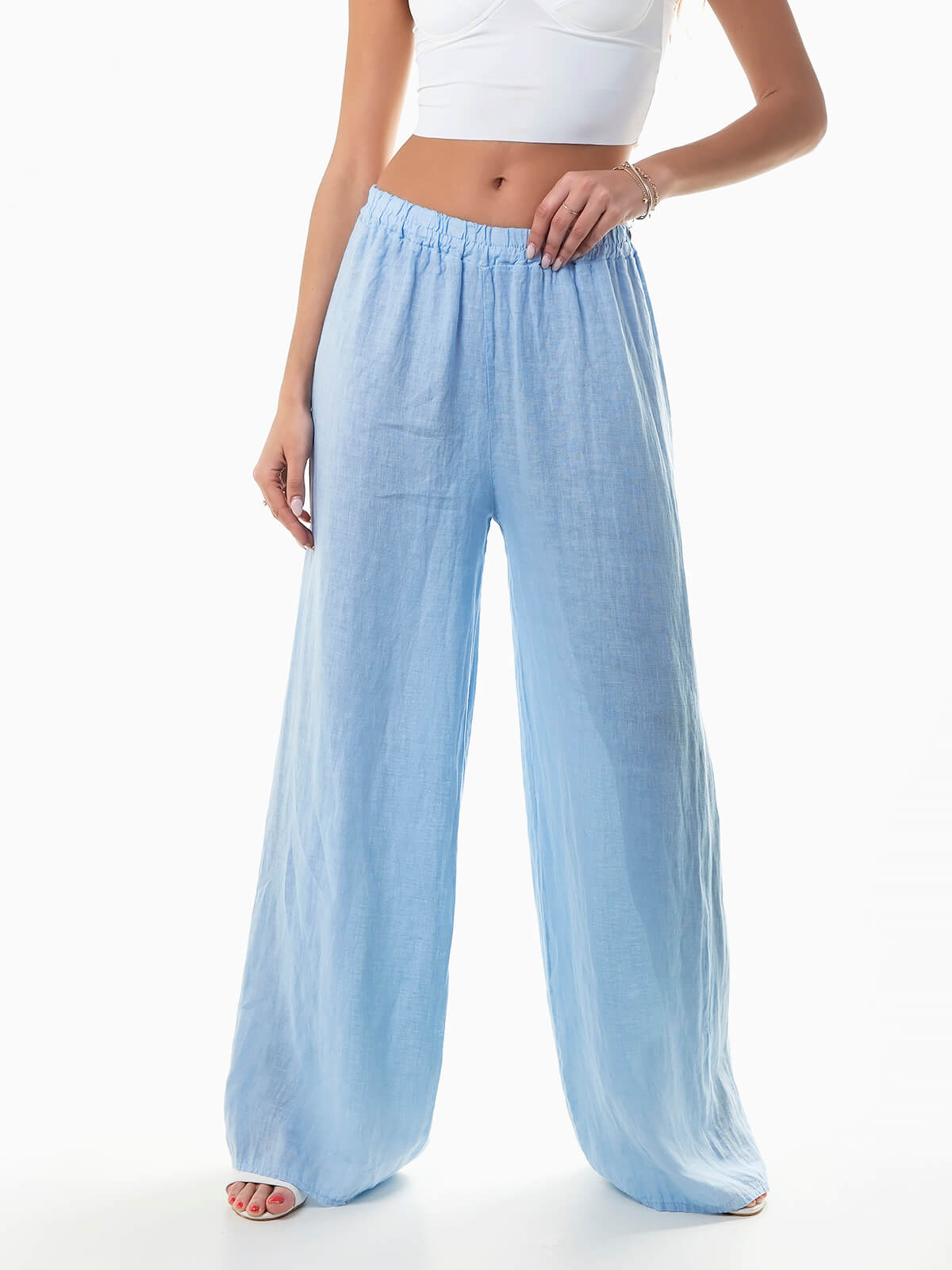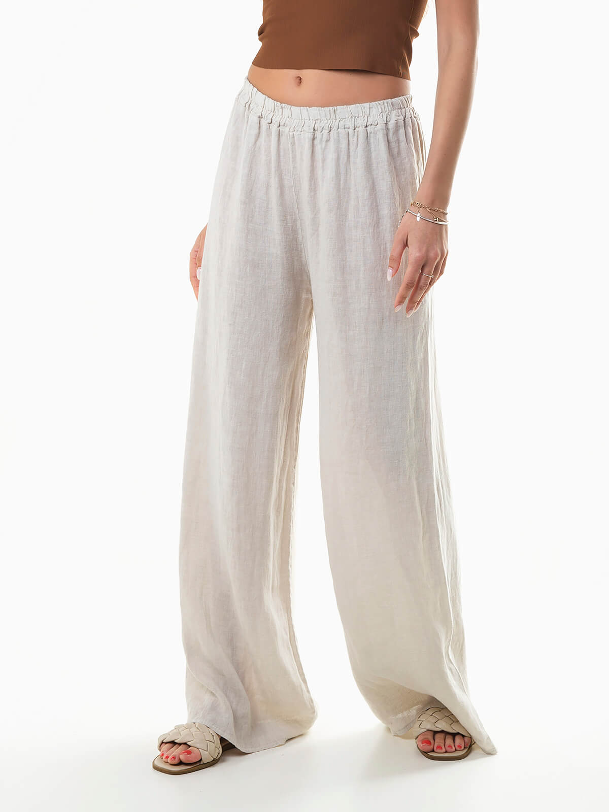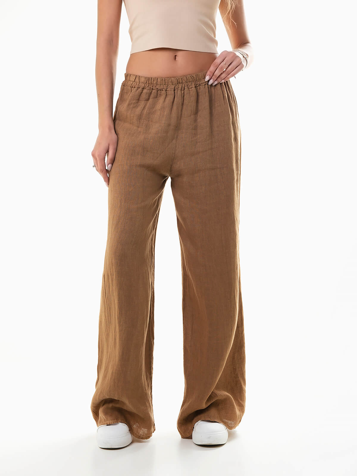 Calças fluídas em tecido 100% linho, respirável e com durabilidade excecional. Calças de cintura alta com elástico.