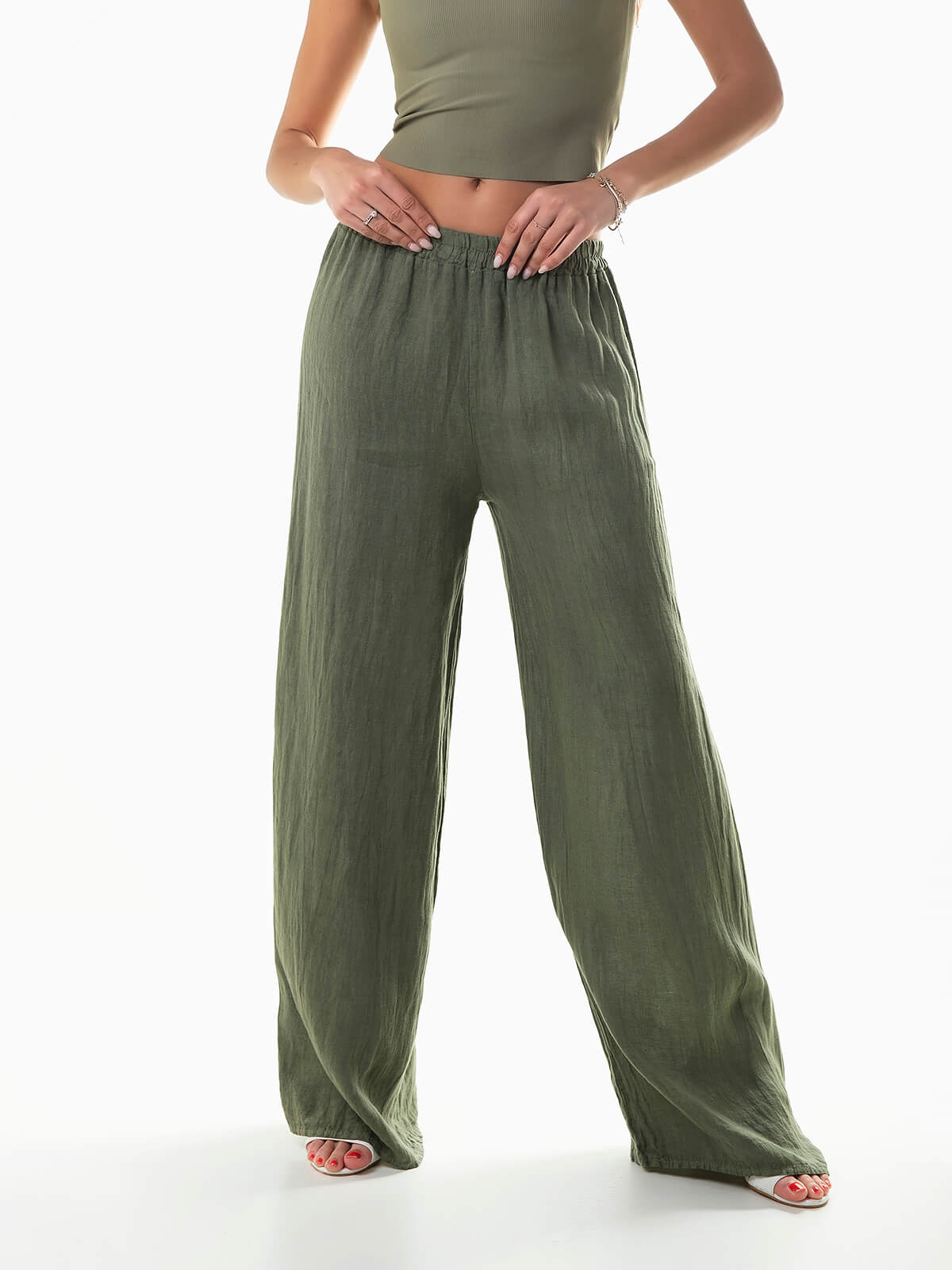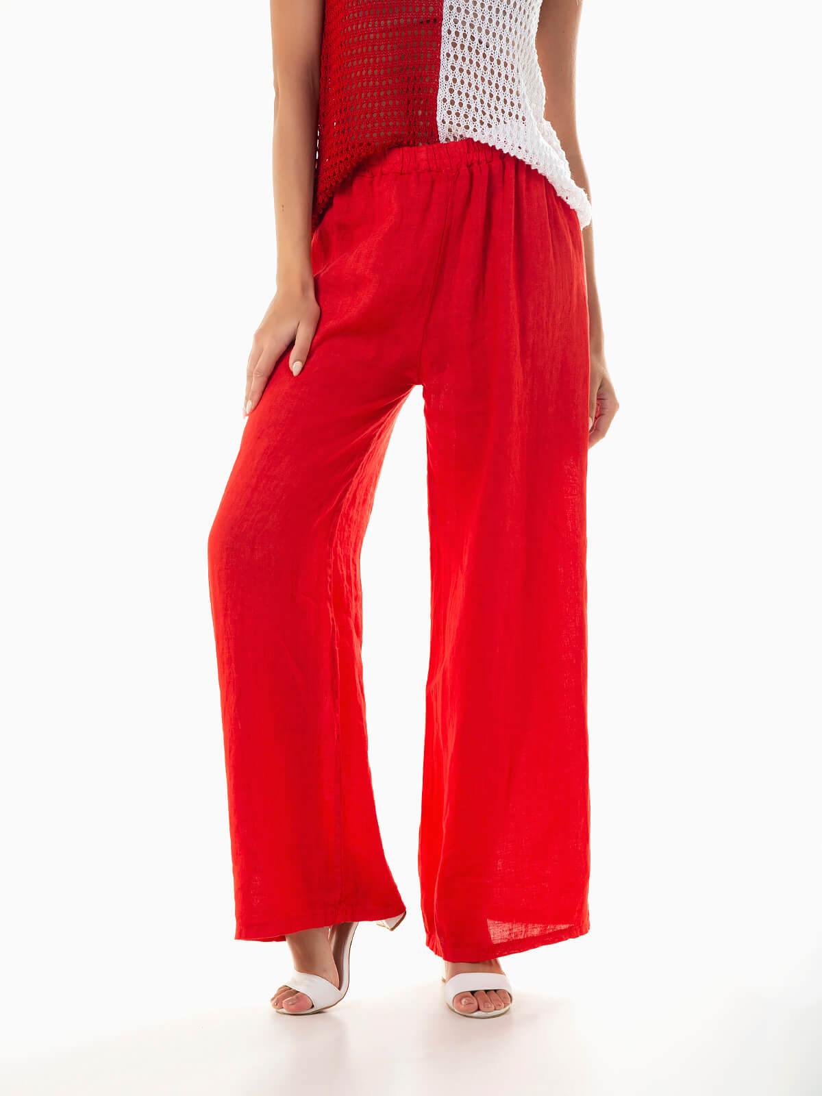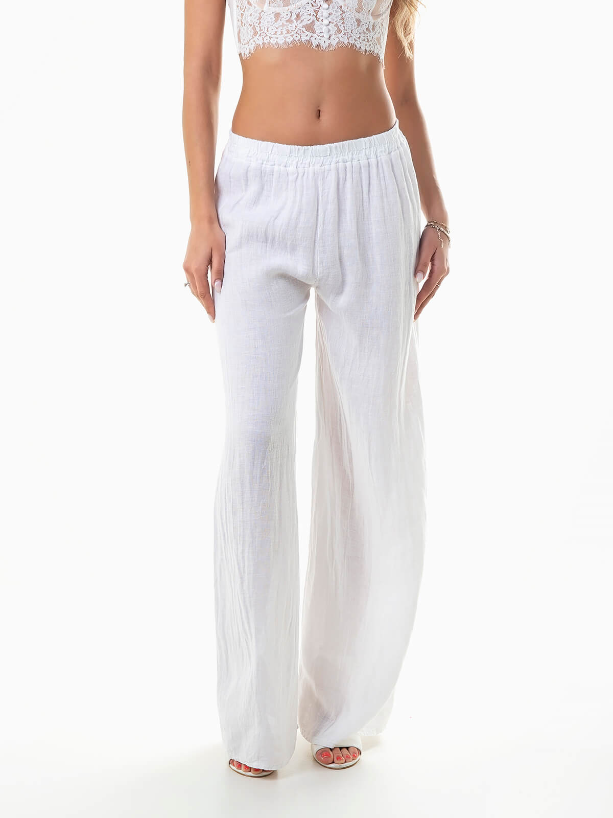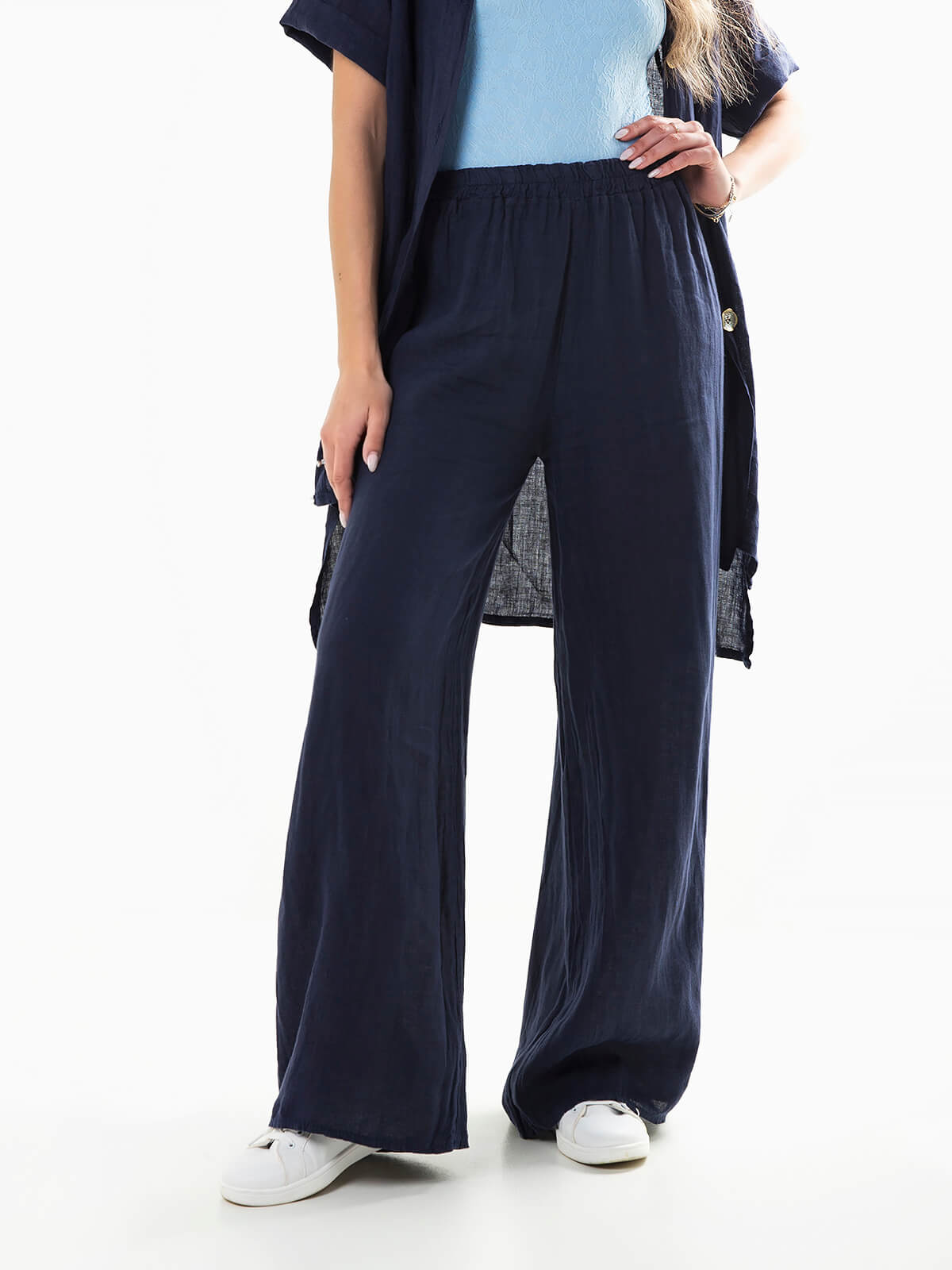Calças fluídas em tecido 100% linho, respirável e com durabilidade excecional. Calças de cintura alta com elástico.