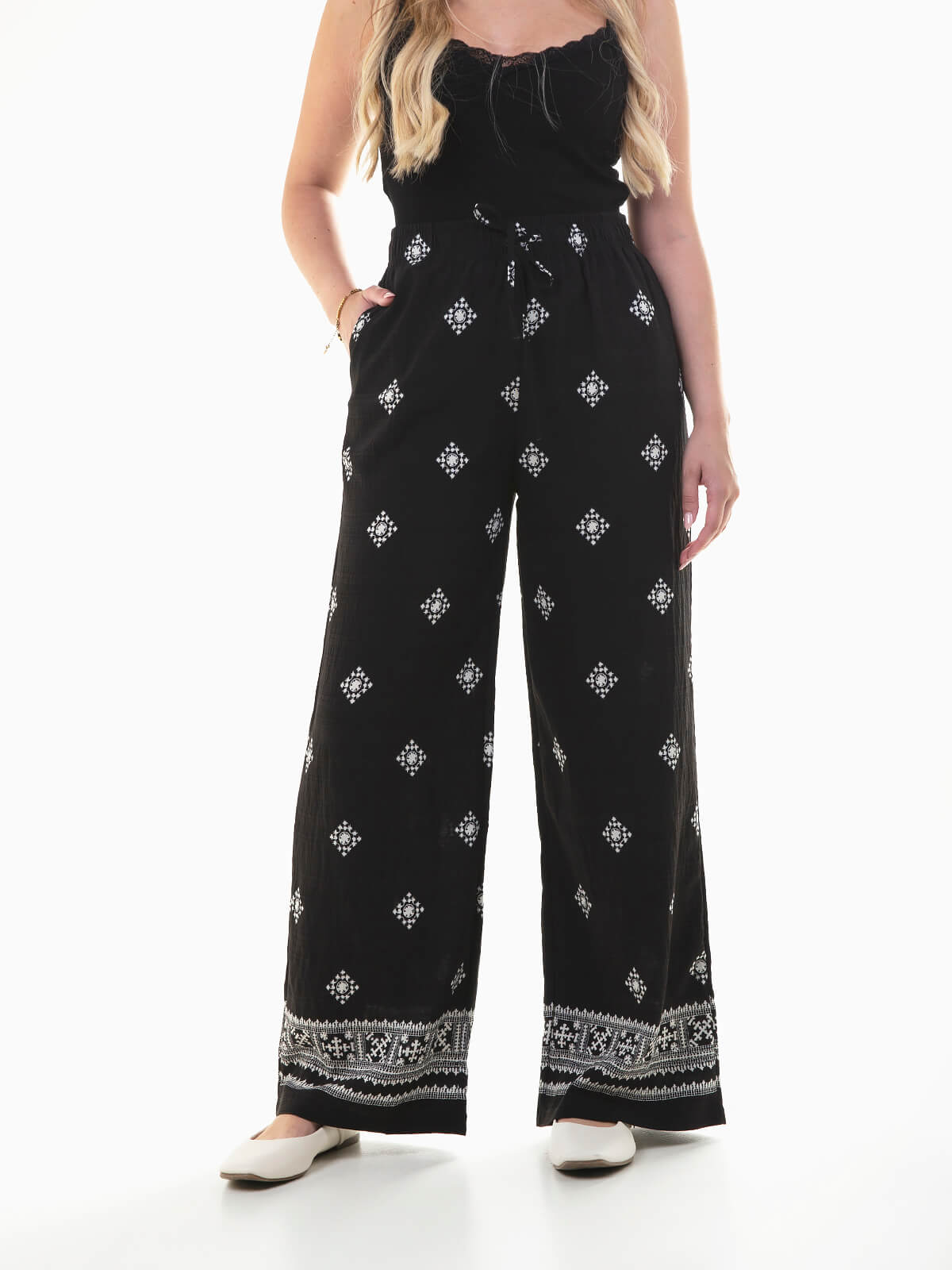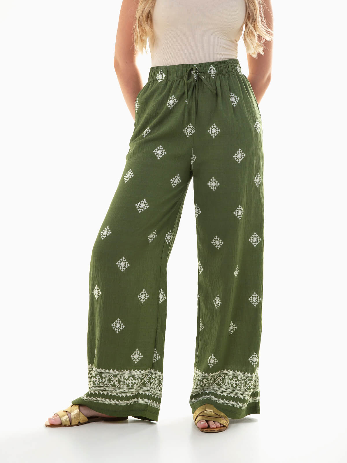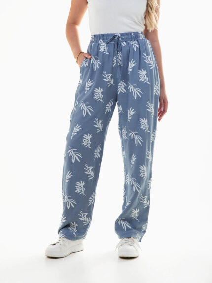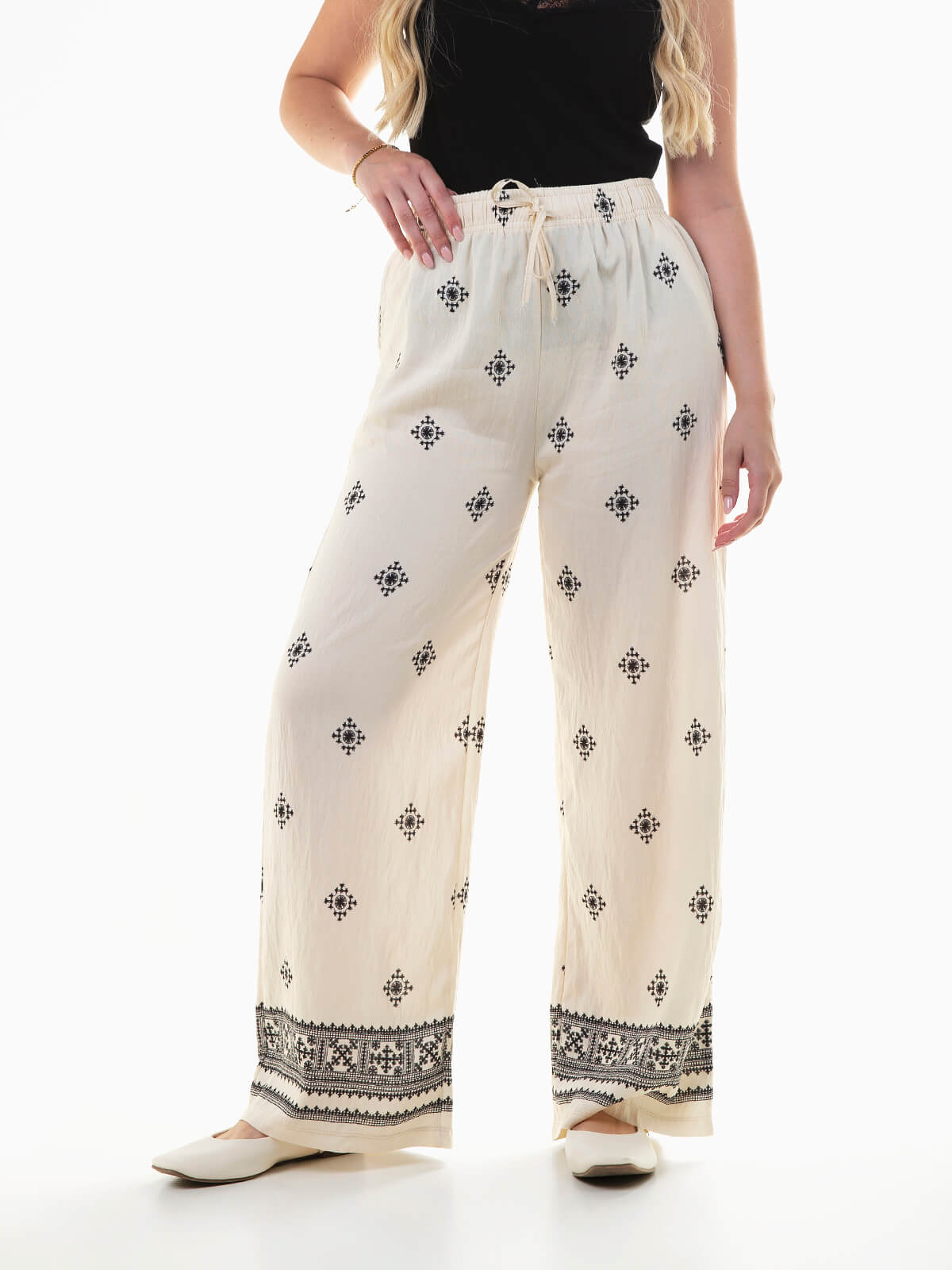 Calças fluídas com estampado étnico para senhora. Calças de cintura alta elástica com cordão para laço. 2 bolsos.