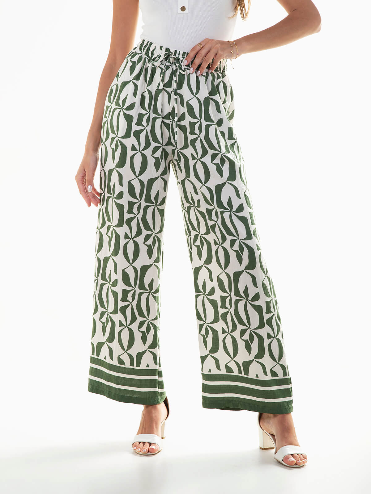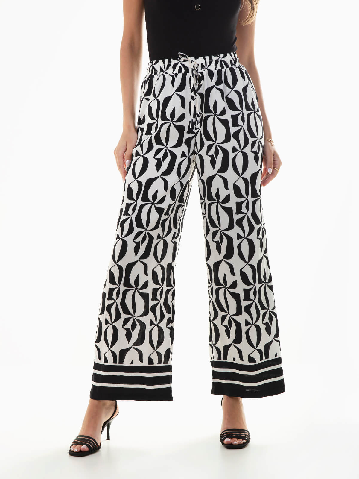Calças fluídas com estampado geométrico para senhora. Calças de cintura alta elástica com cordão para laço e 2 bolsos.