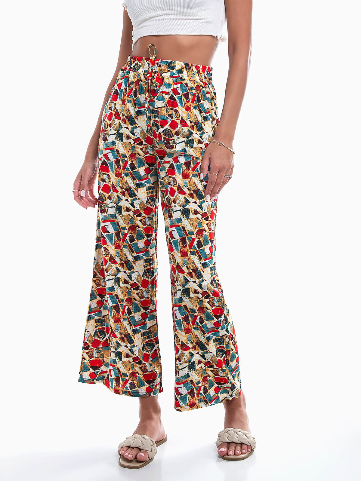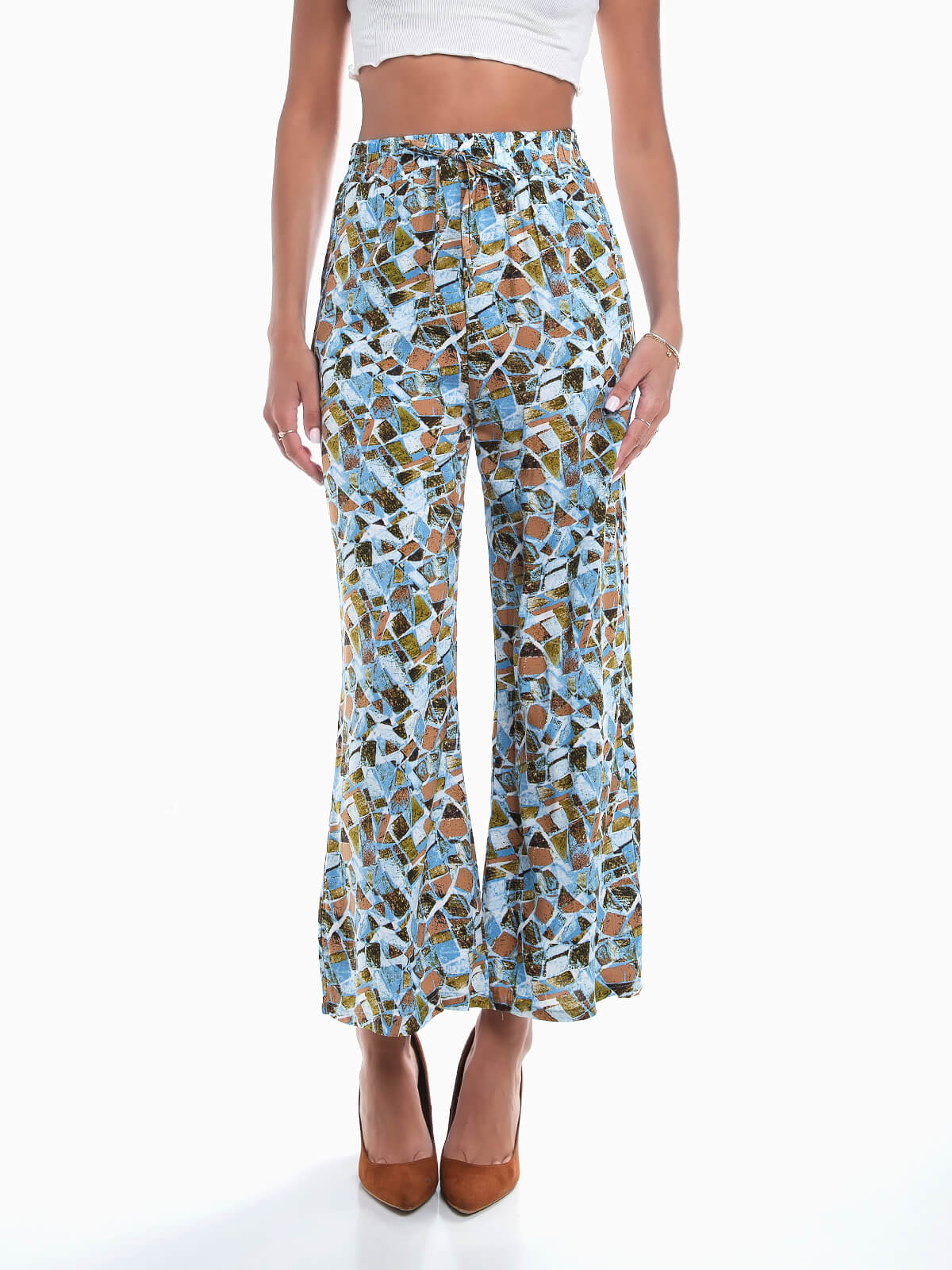 Calças fluídas com estampado geométrico para senhora. Calças de cintura alta elástica com 2 bolsos. Cordão para laço.