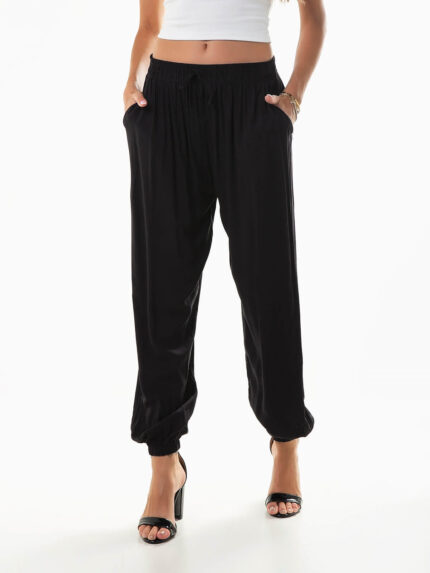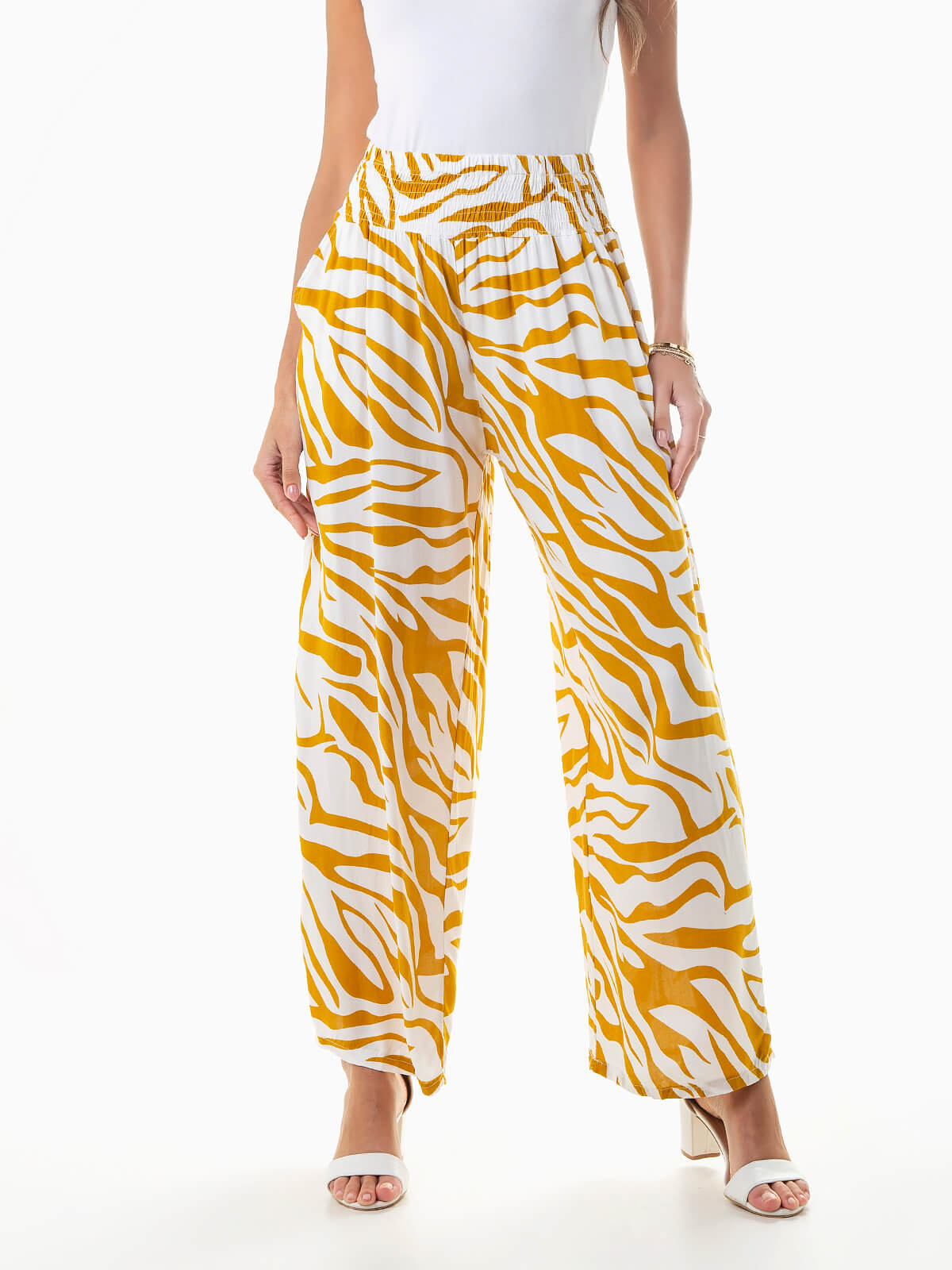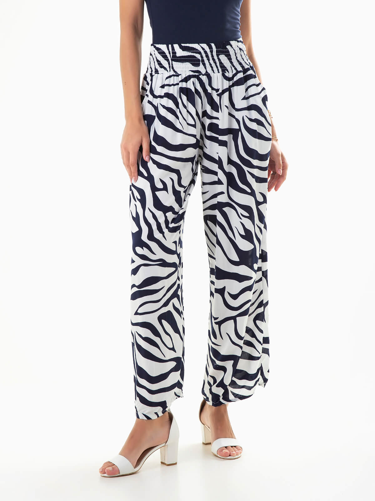 Calças fluídas com animal print para senhora. Calças de cintura alta franzida com 2 bolsos.