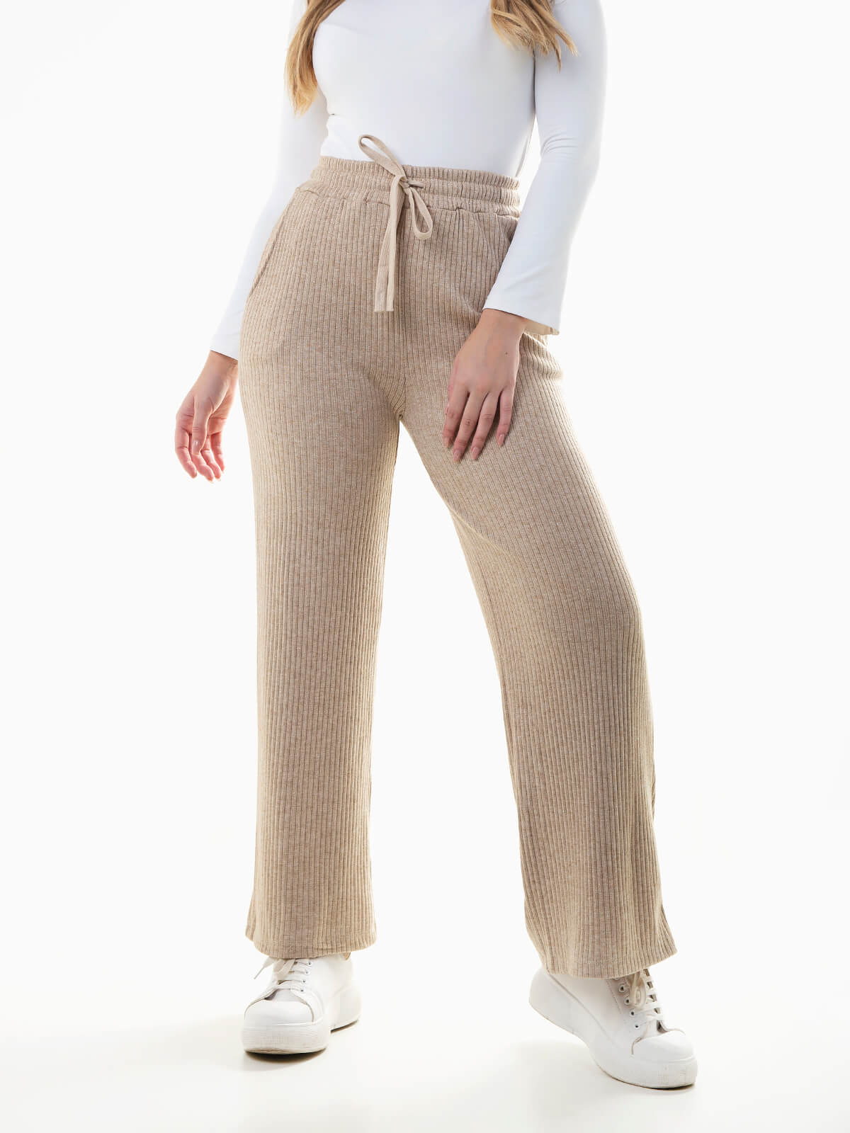 Início Mulher Calças Calças fluídas malha canelada