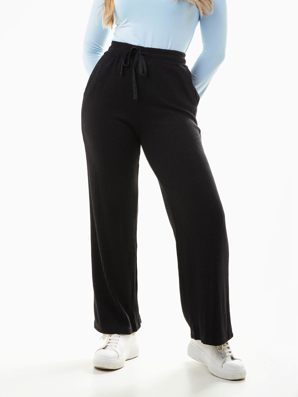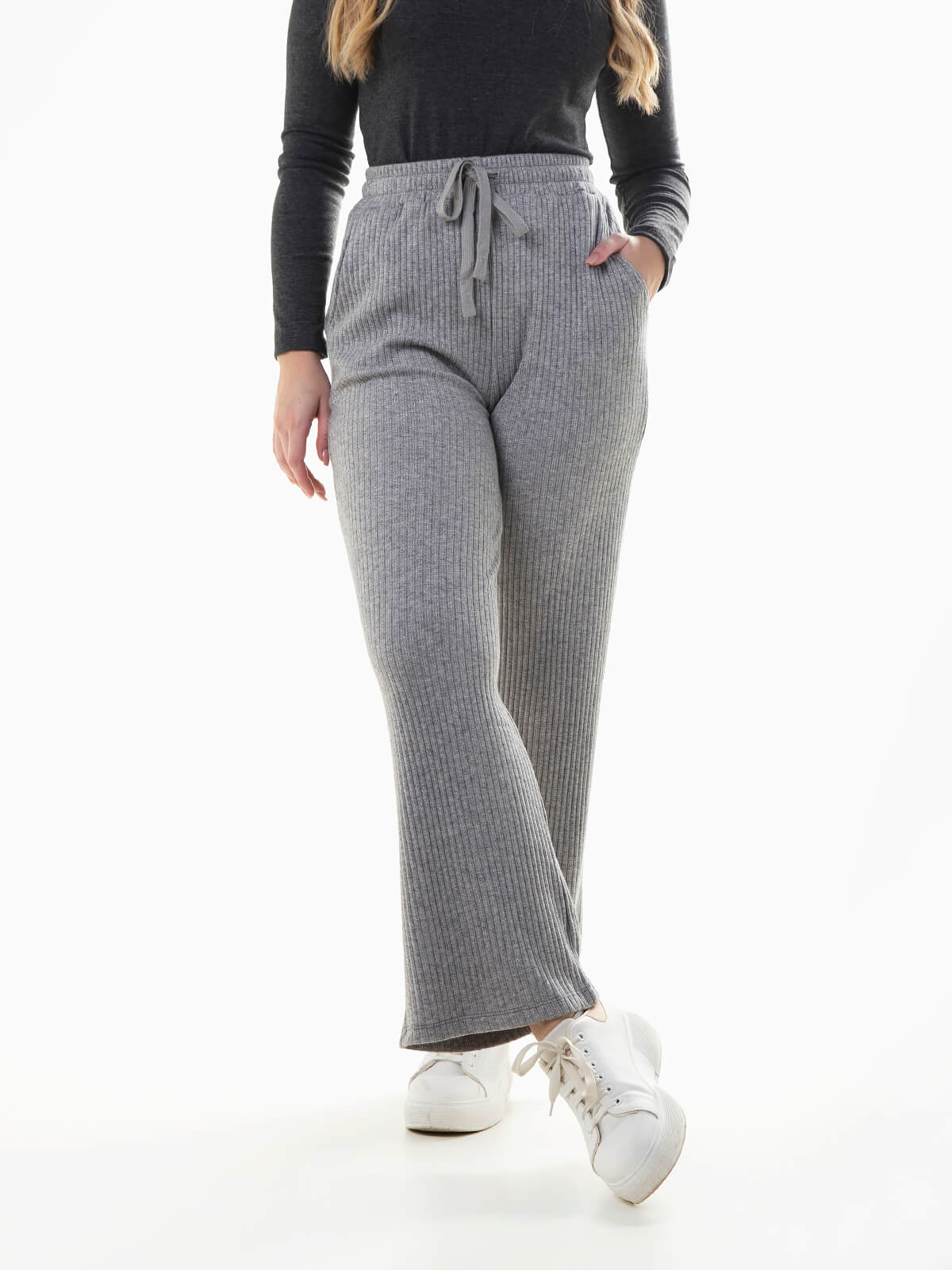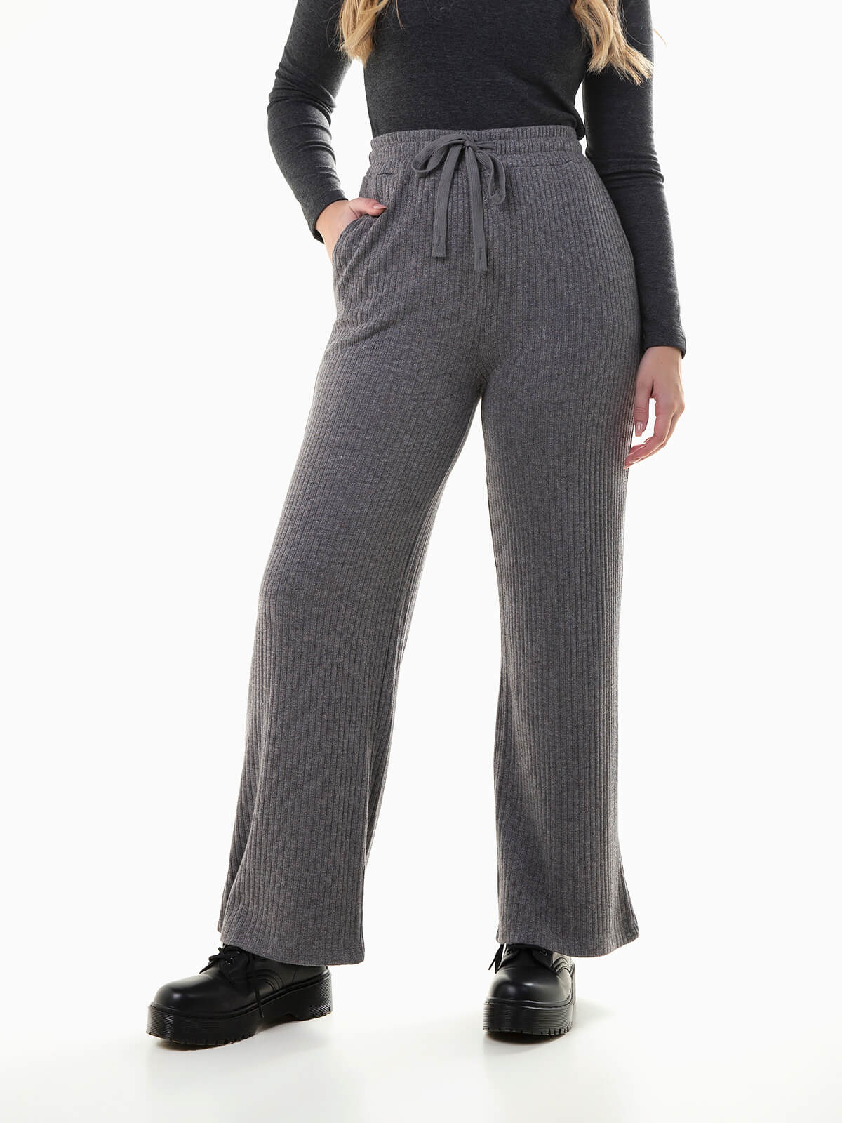 Calças fluídas malha canelada
