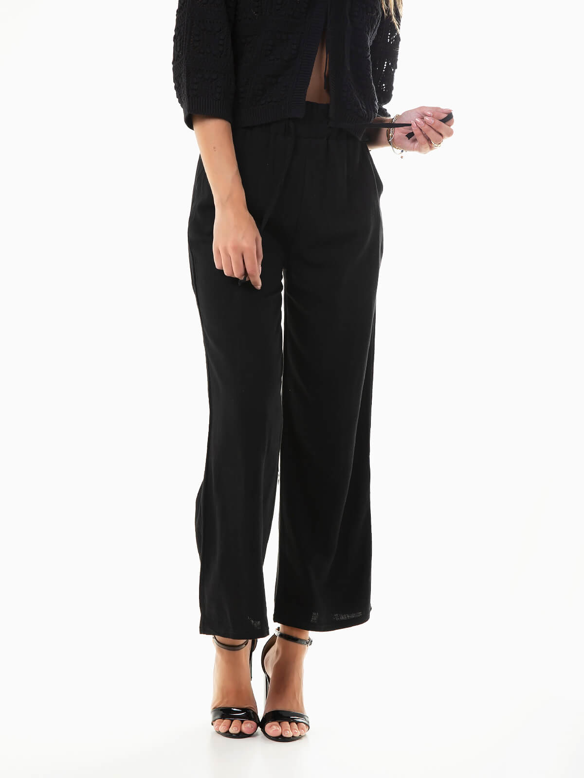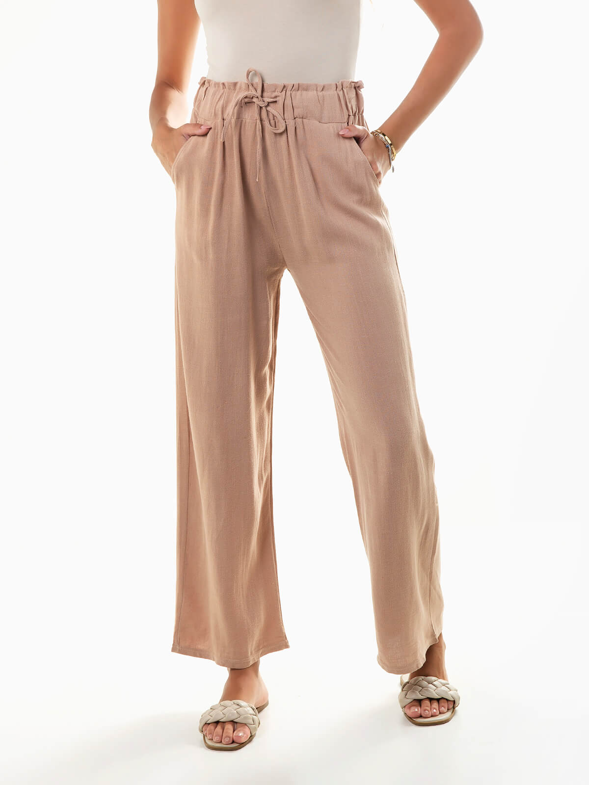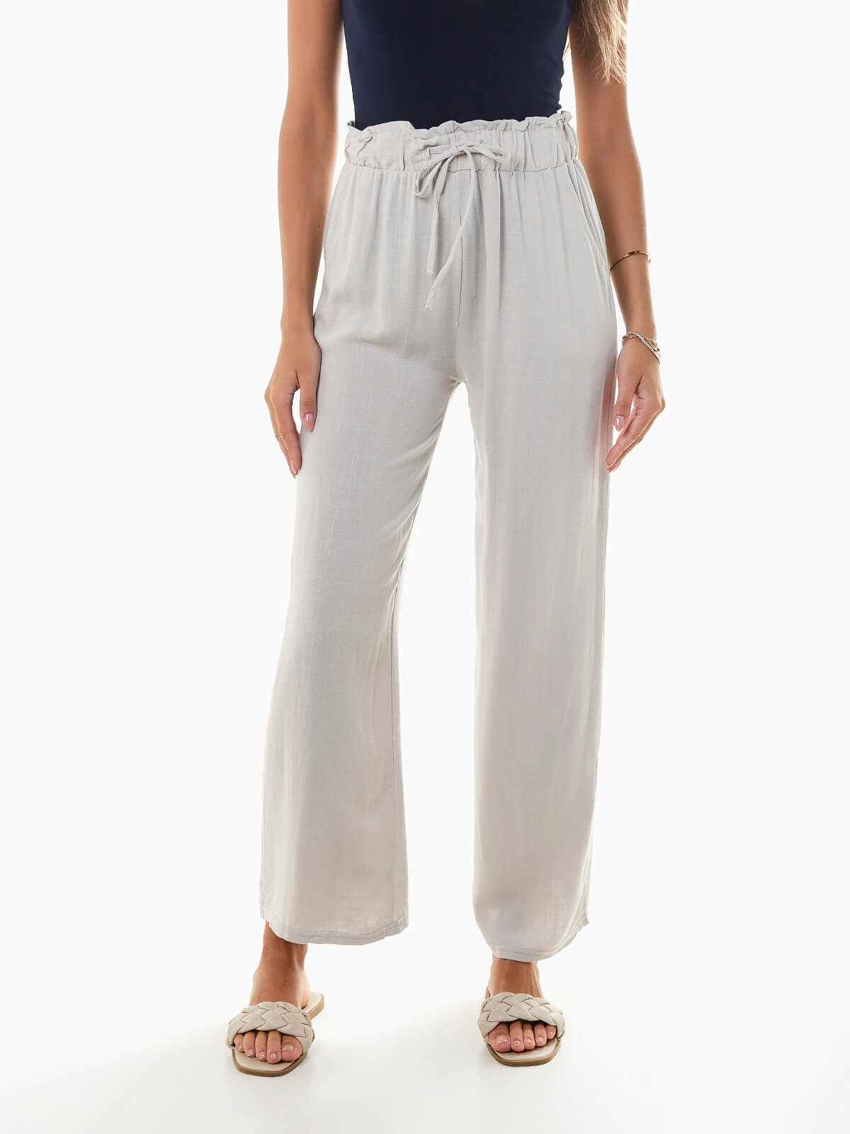 Calças fluídas confecionadas em tecido com mistura de linho, ideais para os dias mais quentes. Calças de cintura alta paperbag e cordão para ajustar. 2 bolsos.