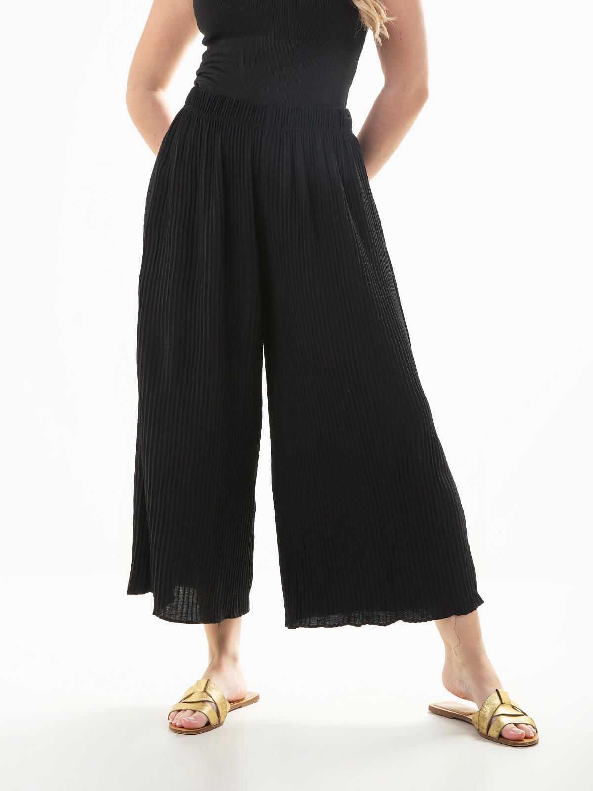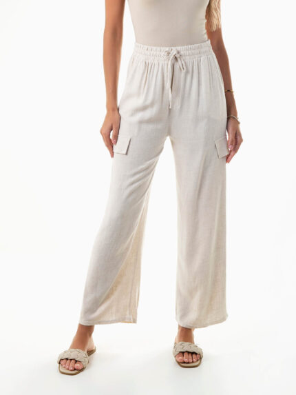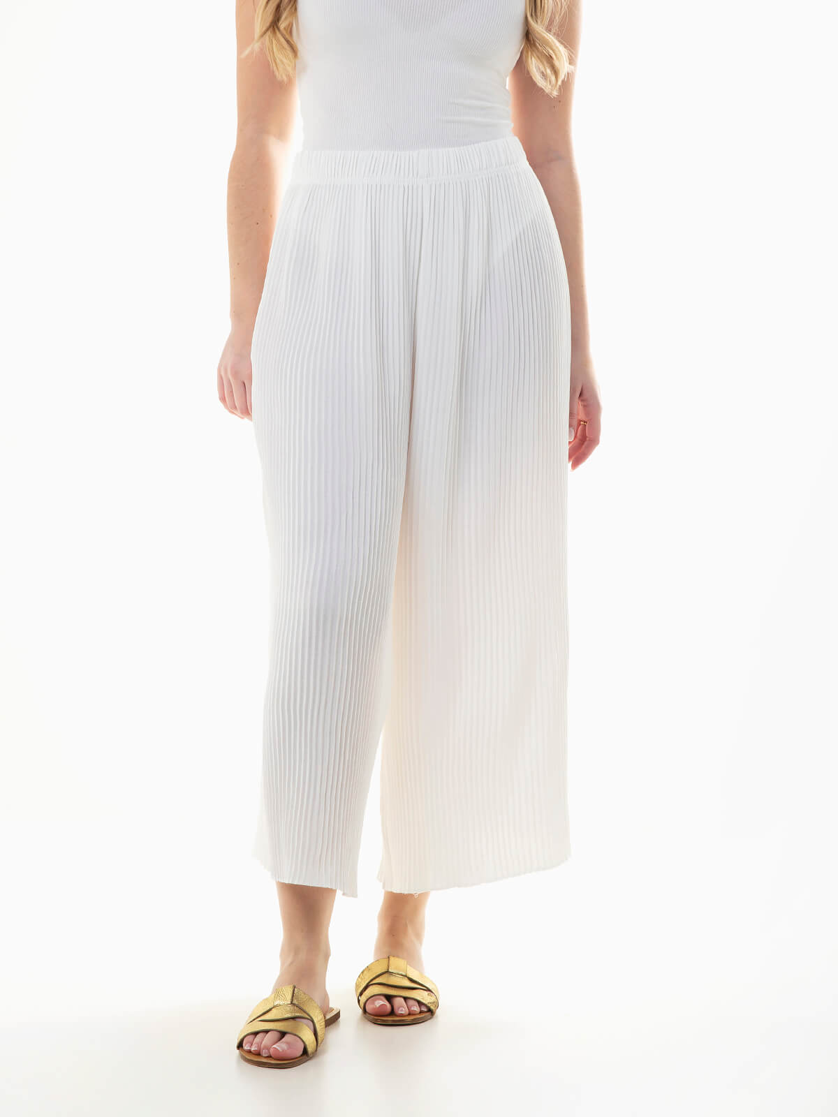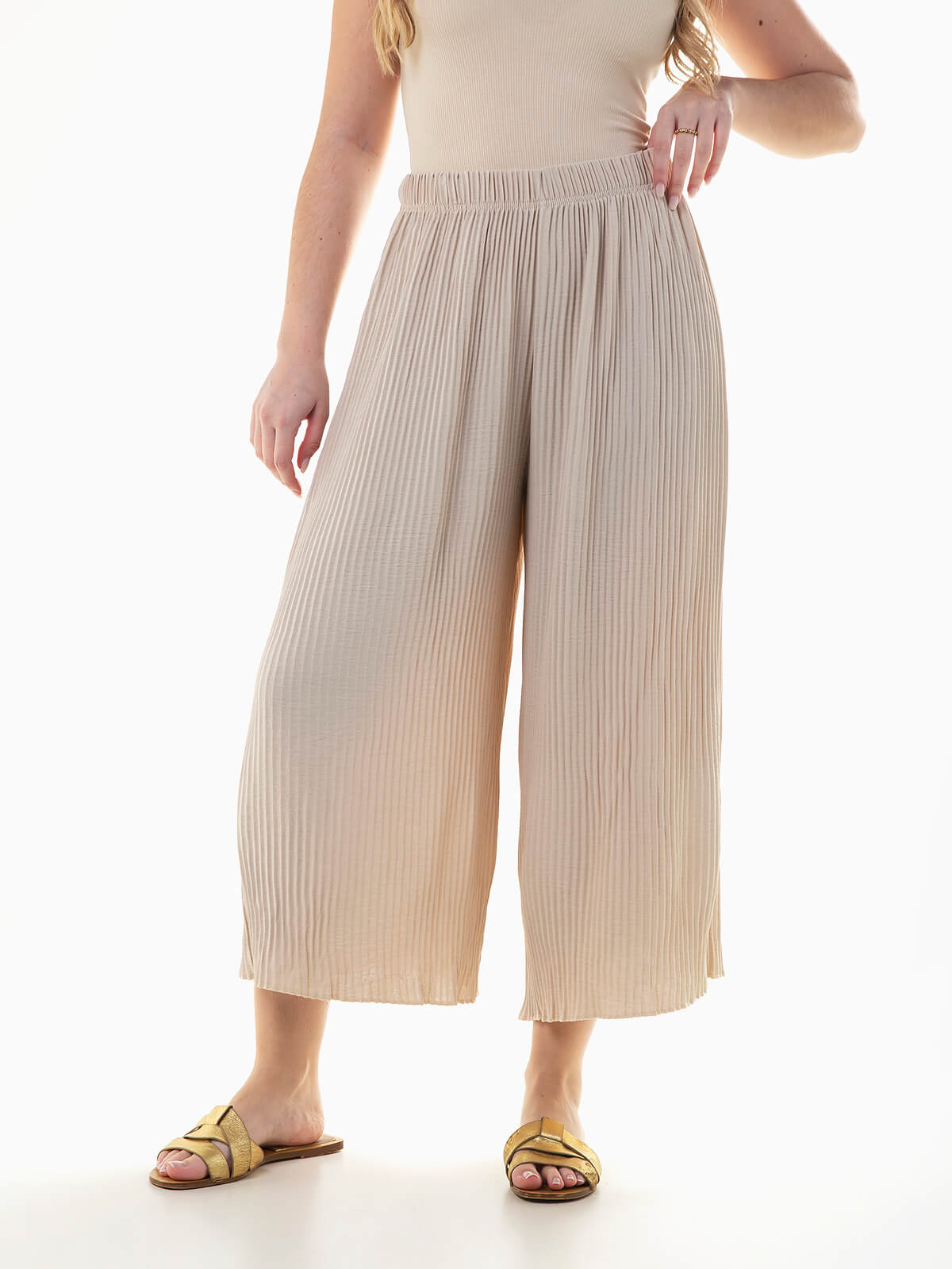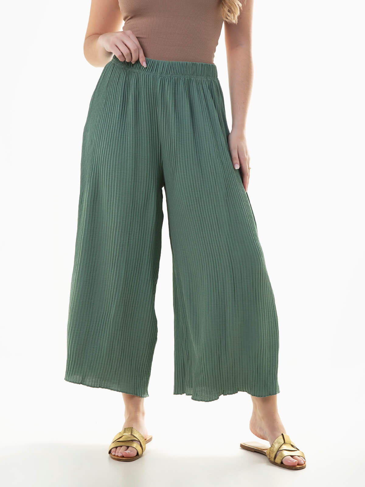 Calças fluídas plissadas para senhora. Calças de cintura alta elástica.