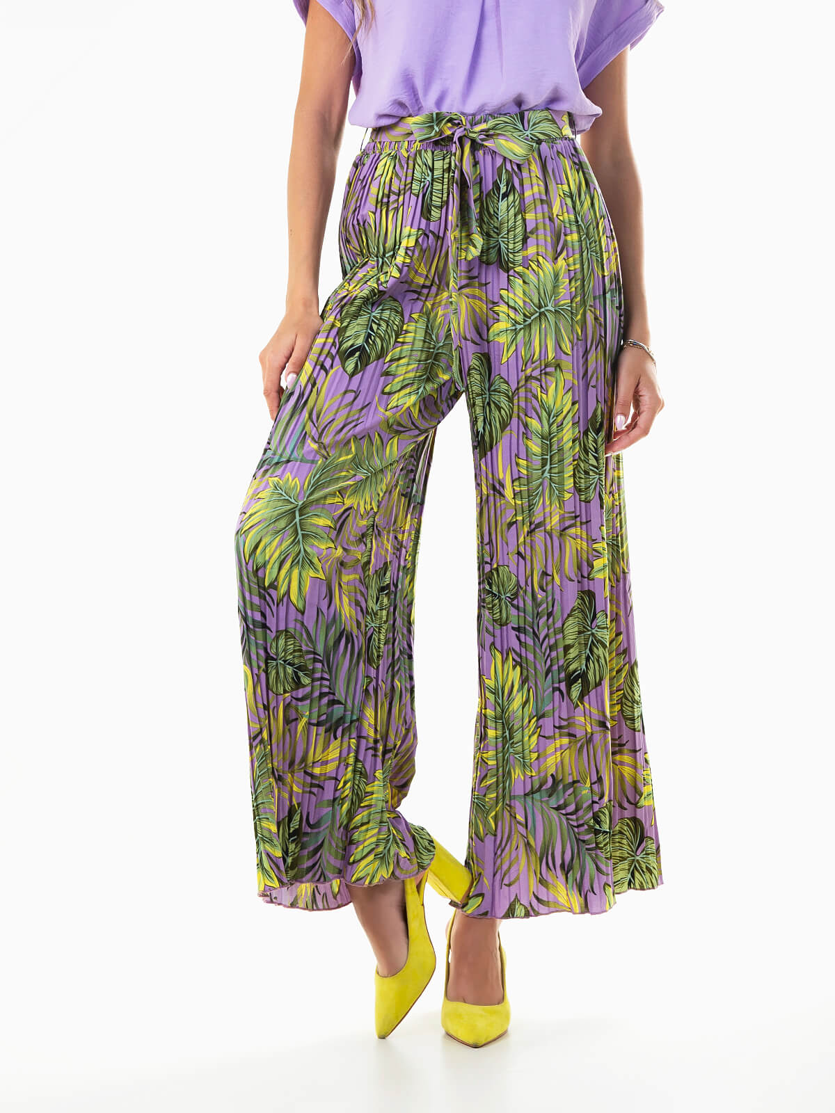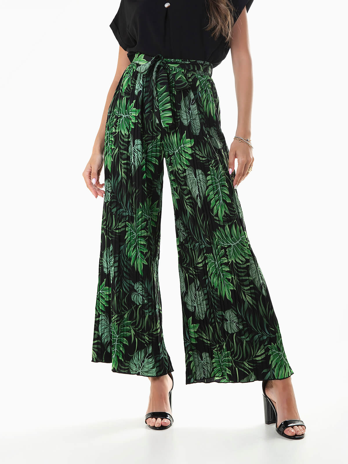 Calças fluídas plissadas com estampado de folhas. Calças com cintura alta elástica e cinto no mesmo tecido para laço.