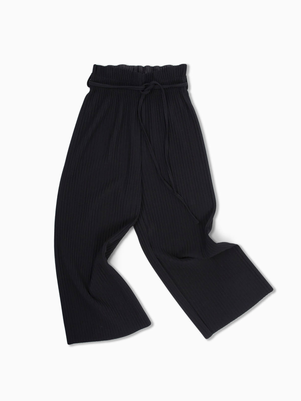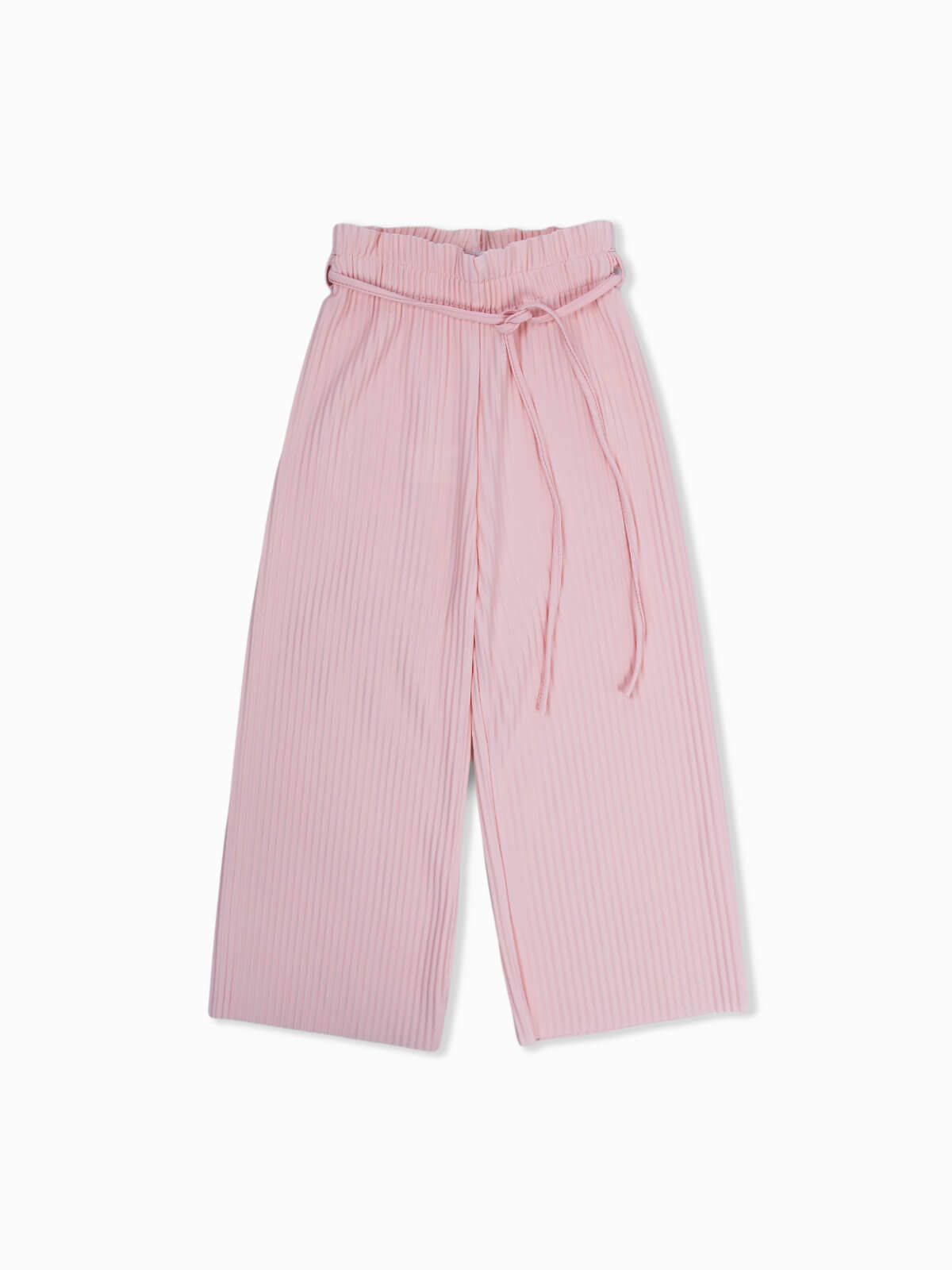 Calças fluídas plissadas para menina. Calças com cintura elástica e cordão para laço.
