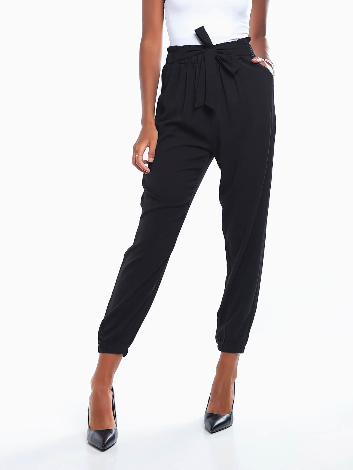 Calças fluídas com punhos elásticos para senhora. Calças de cintura alta elástica com tiras aplicadas para laço. 2 bolsos dos lados.