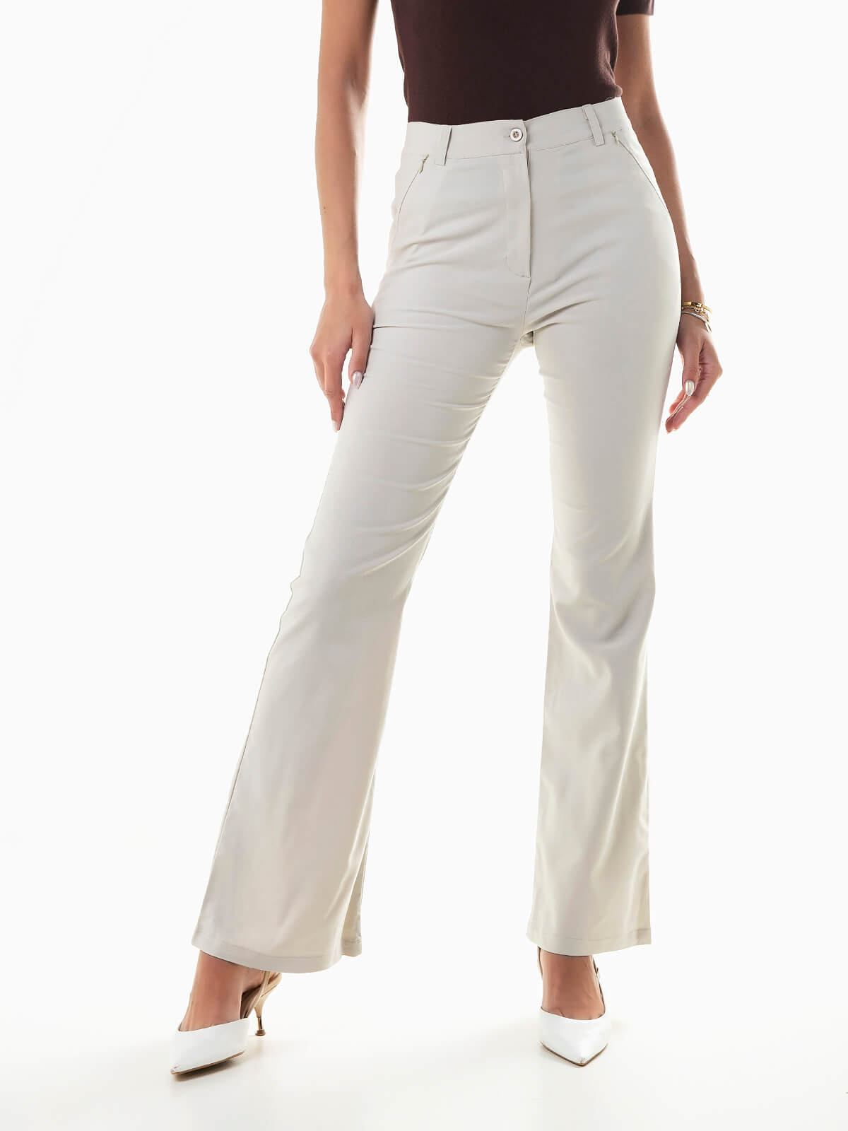 Calças de tecido formal à boca de sino para senhora. Calças elásticas de cintura alta com dois fechos invisíveis na frente. Aperto fecho éclair e botão.