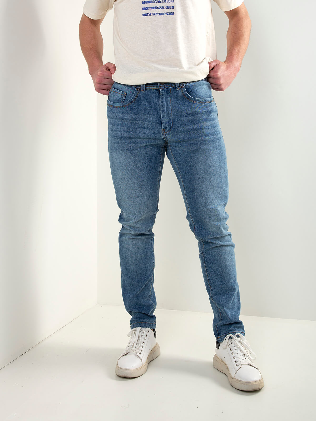 Calças de ganga de homem em denim azul com efeito ligeiramente lavado. Modelo slim fit com cinco bolsos, fecho frontal com botão e presilhas para cinto. Confortáveis e versáteis, ideais para looks casuais do dia a dia.
