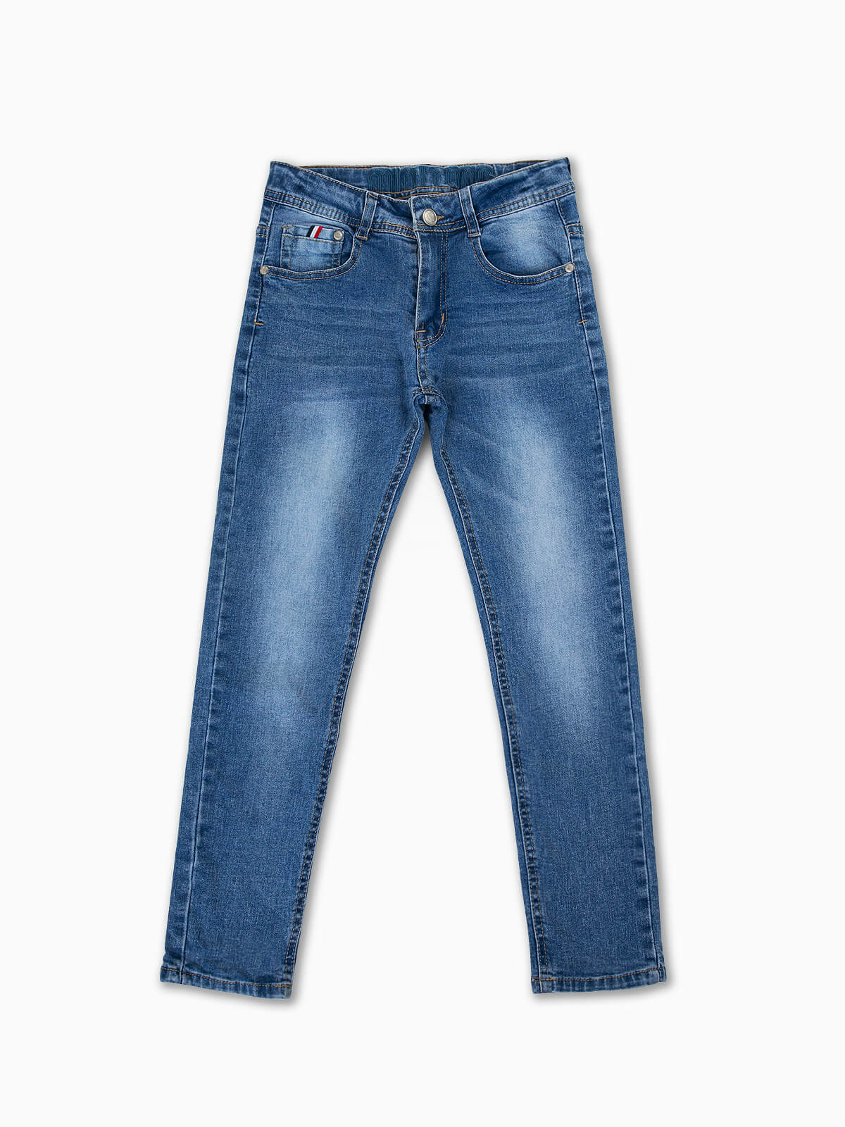 Calças ganga com lavagem azul claro para menino. Jeans elásticas com ajustador no interior. 5 bolsos. Aperto fecho éclair e botão.