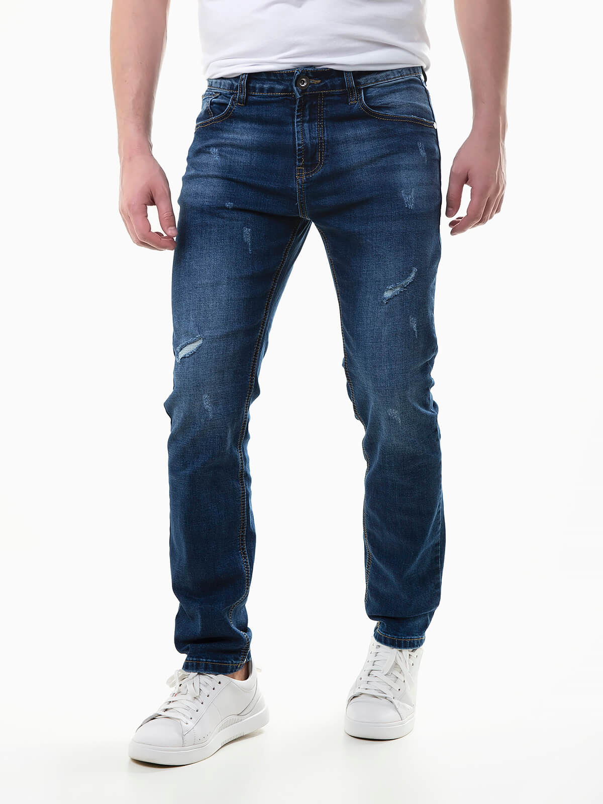 Calças ganga com lavagem azul escuro com pequenos rasgos para homem. Calças elásticas com 5 bolsos. Aperto fecho éclair e botão.
