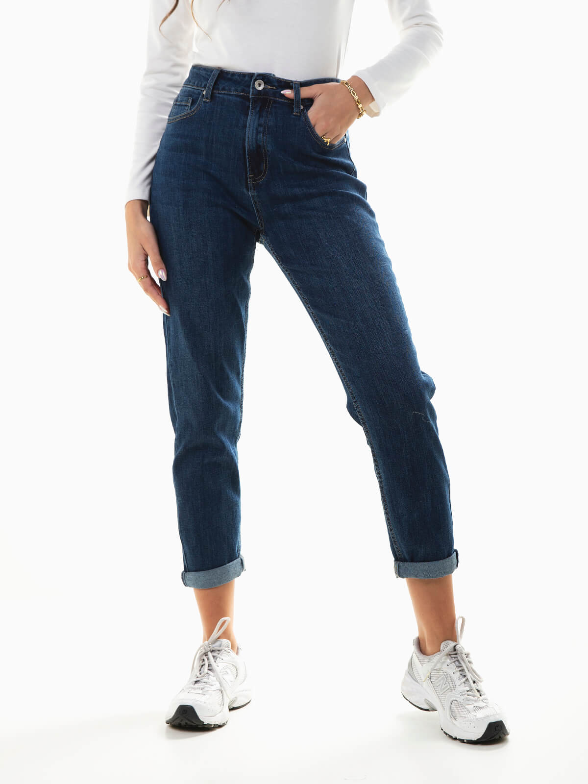 Calças de ganga mom fit com lavagem azul escuro para senhora. Jeans tapered de cintura alta com dobra na base. 5 bolsos. Aperto fecho éclair e botão.