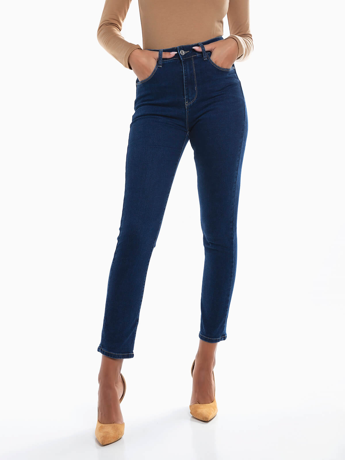 Calças ganga lavagem azul escuro com efeito push-up. Jeans elásticas para senhora com cintura alta. 5 bolsos. Aperto fecho éclair e botão.