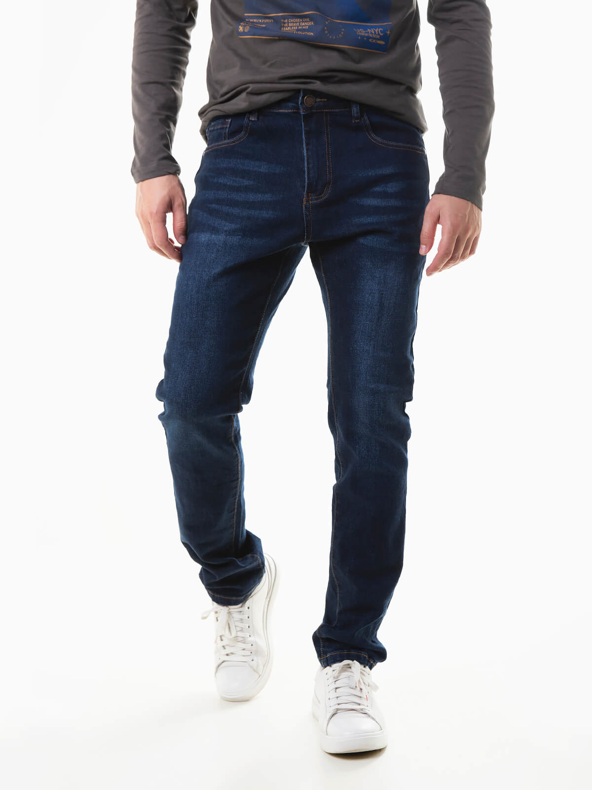 Calças ganga de corte regular para homem com lavagem azul escuro. Jeans com 5 bolsos. Aperto fecho éclair e botão.