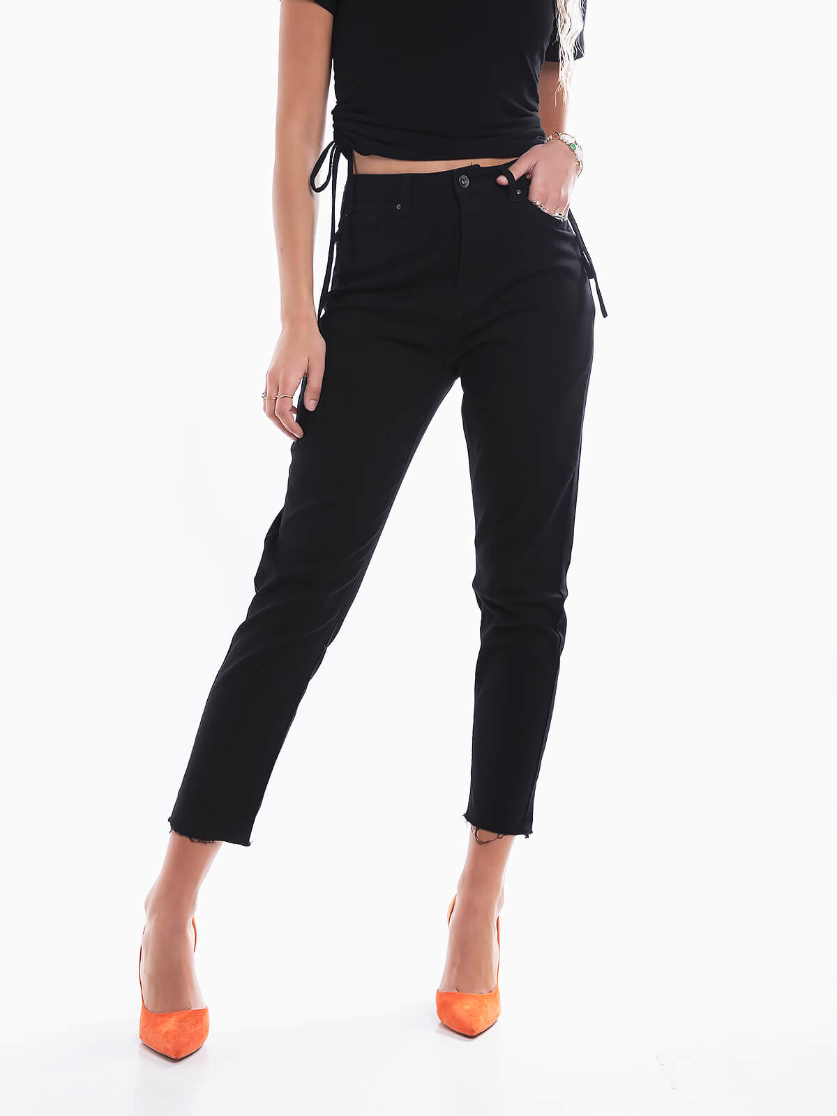 Calças de cintura alta com bainhas desfiadas para senhora. Calças de ganga. 5 bolsos. Aperto de fecho éclair e botão.
