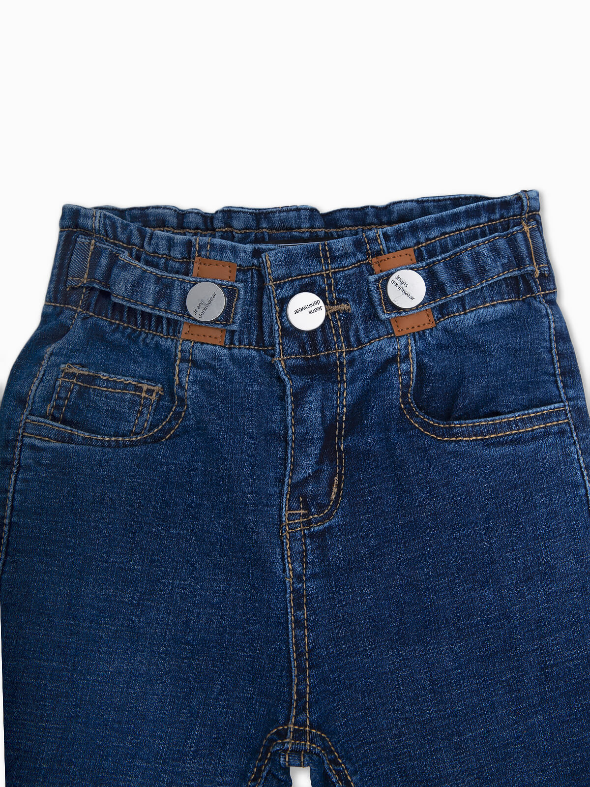 Calças de ganga de bebé menina com fivelas aplicadas para efeito. Jeans de cintura elástica. 5 bolsos. Aperto de fecho éclair e botão.