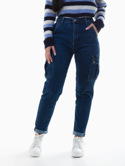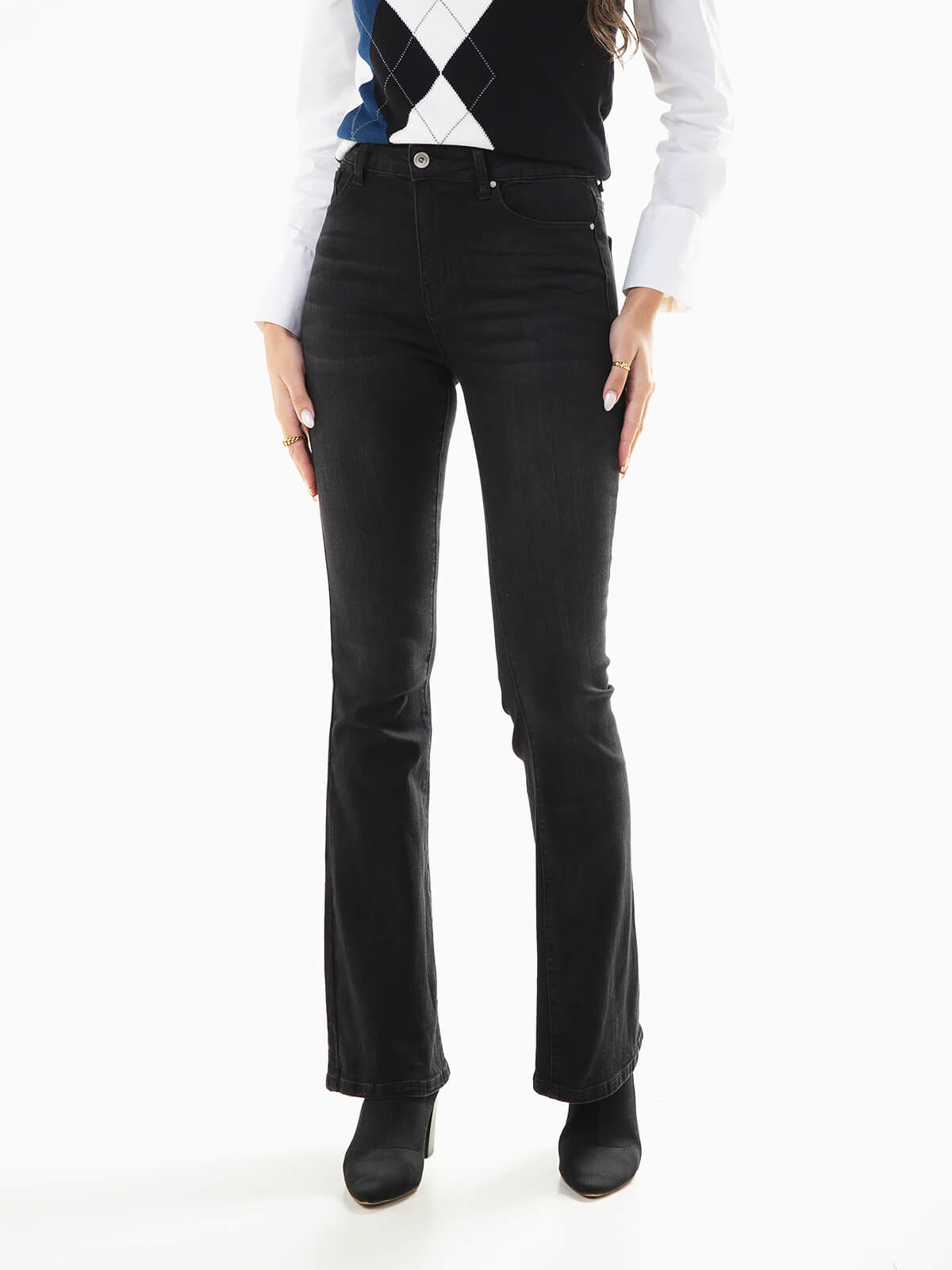 Calças de ganga boca de sino pretas para mulher. Jeans de cintura alta com 5 bolsos. Aperto fecho éclair e botão.