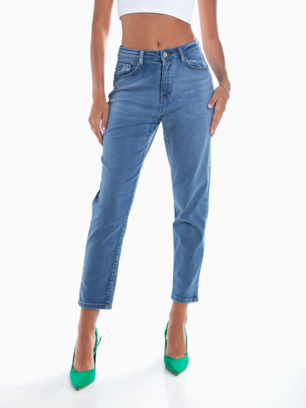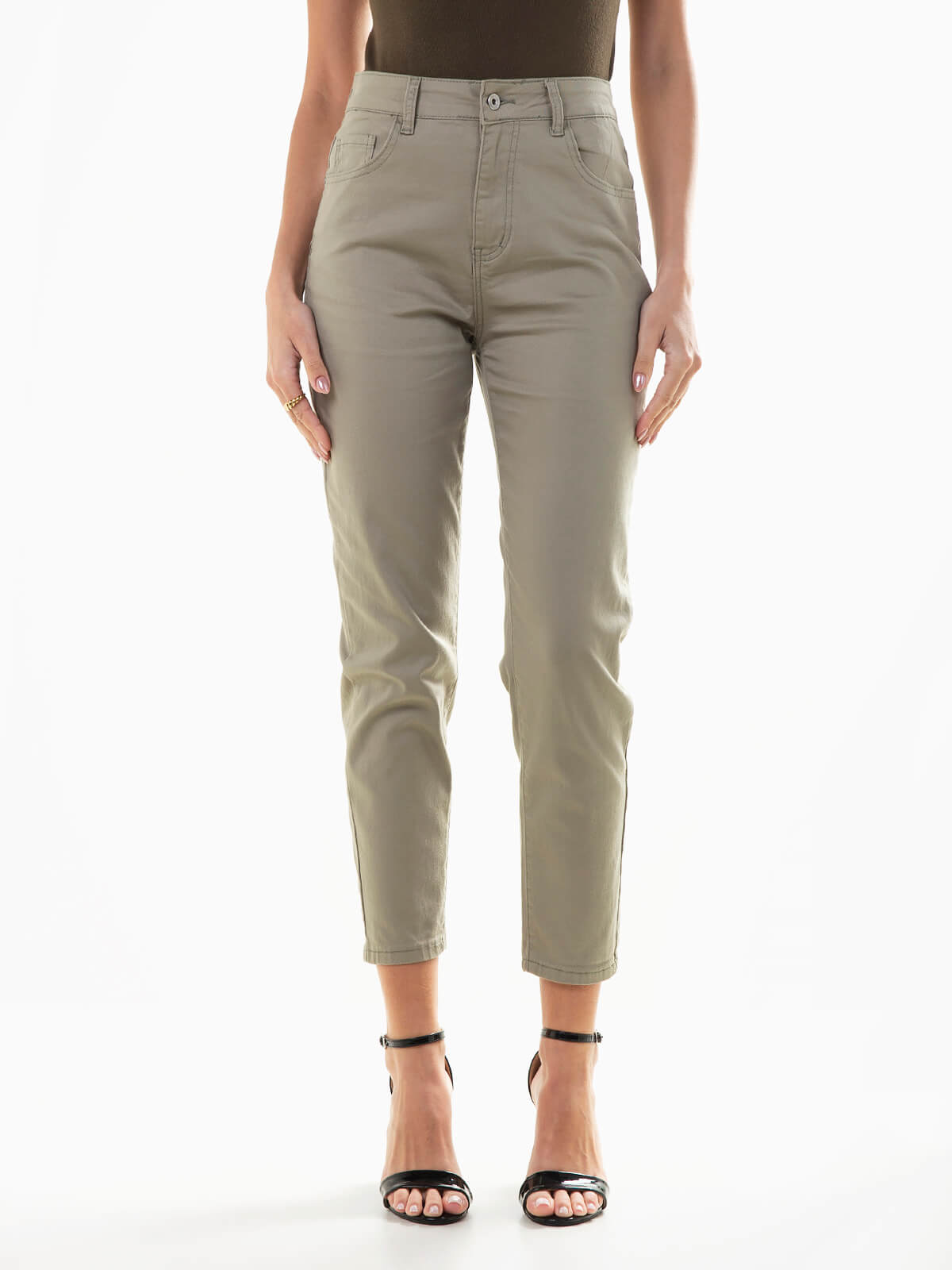 Calças de ganga boyfriend verdes para senhora. Jeans de cintura alta com 5 bolsos. Aperto de fecho éclair e botão.