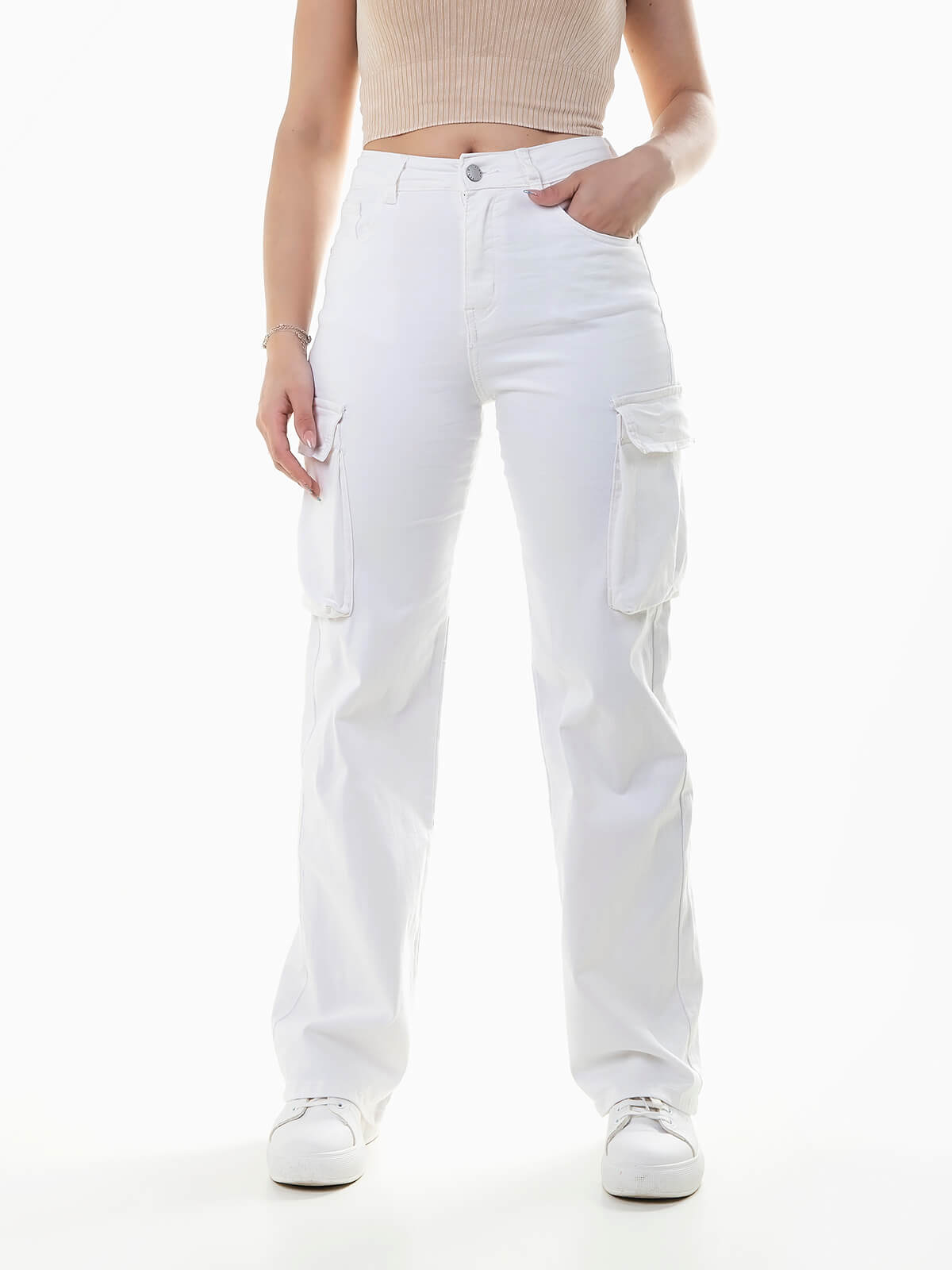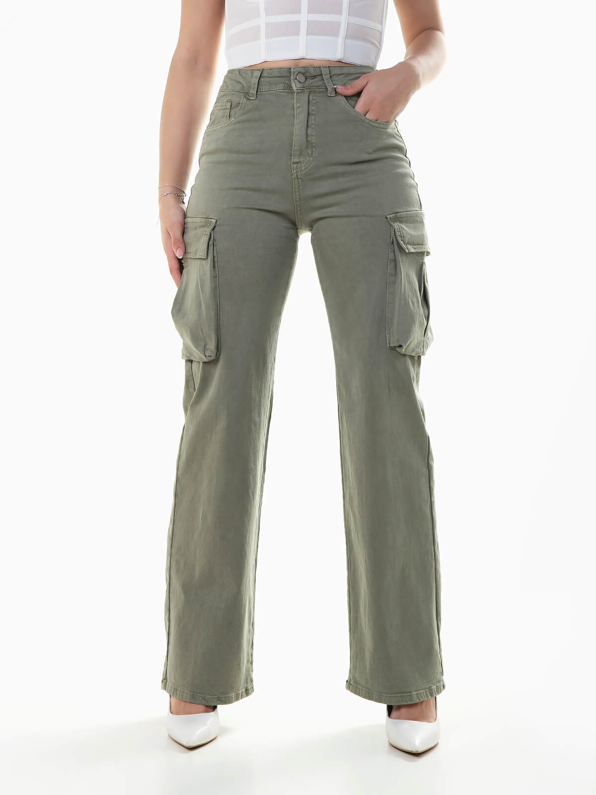 Calças ganga straight fit estilo cargo para senhora. Jeans elásticas de cintura alta com 7 bolsos. Aperto de fecho zíper e botão.