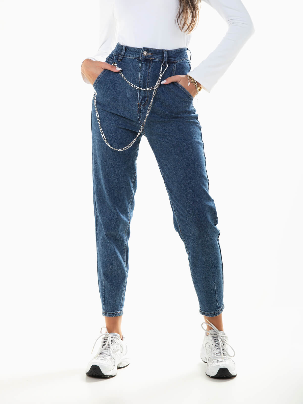 Calças ganga carrot fit com correntes aplicadas à frente para senhora. Jeans de cintura alta com lavagem azul médio e 5 bolsos. Aperto fecho éclair e botão.