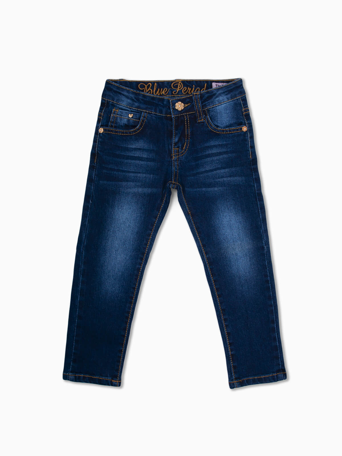 Calças de ganga com aplicações de flores e coração. Jeans elásticas com ajustador no interior e lavagem azul escuro. 5 bolsos. Aperto de fecho éclair e botão.