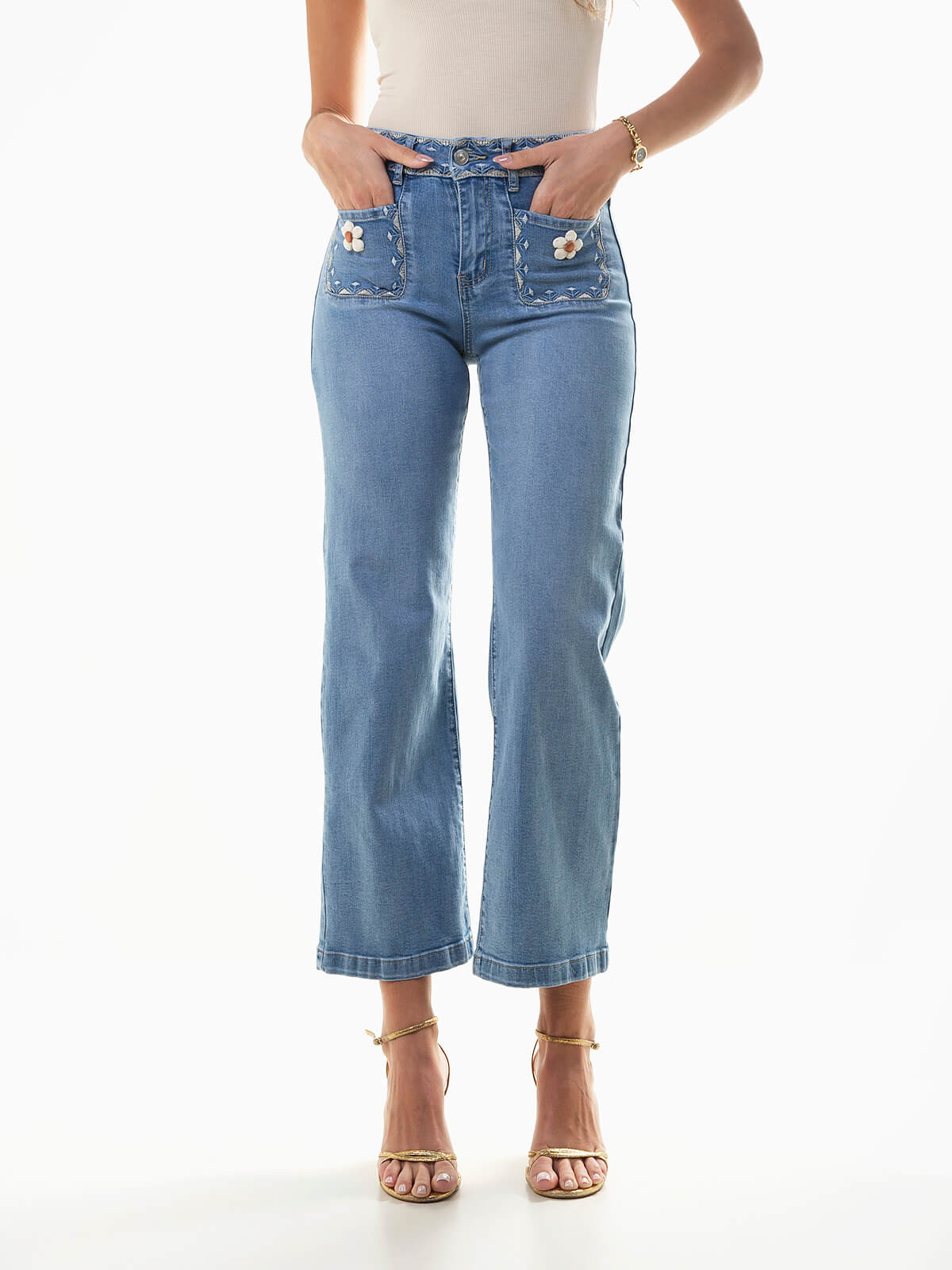 Calças de ganga com flores aplicadas e pormenores bordados. Straight jeans de cintura alta com 4 bolsos. Aperto de fecho zíper e botão. Lavagem azul claro.