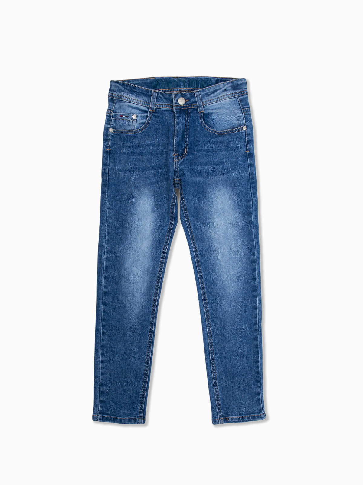 Calças de ganga com leves rotos para menino. Jeans elásticas com lavagem azul claro. 5 bolsos. Aperto de fecho éclair e botão.