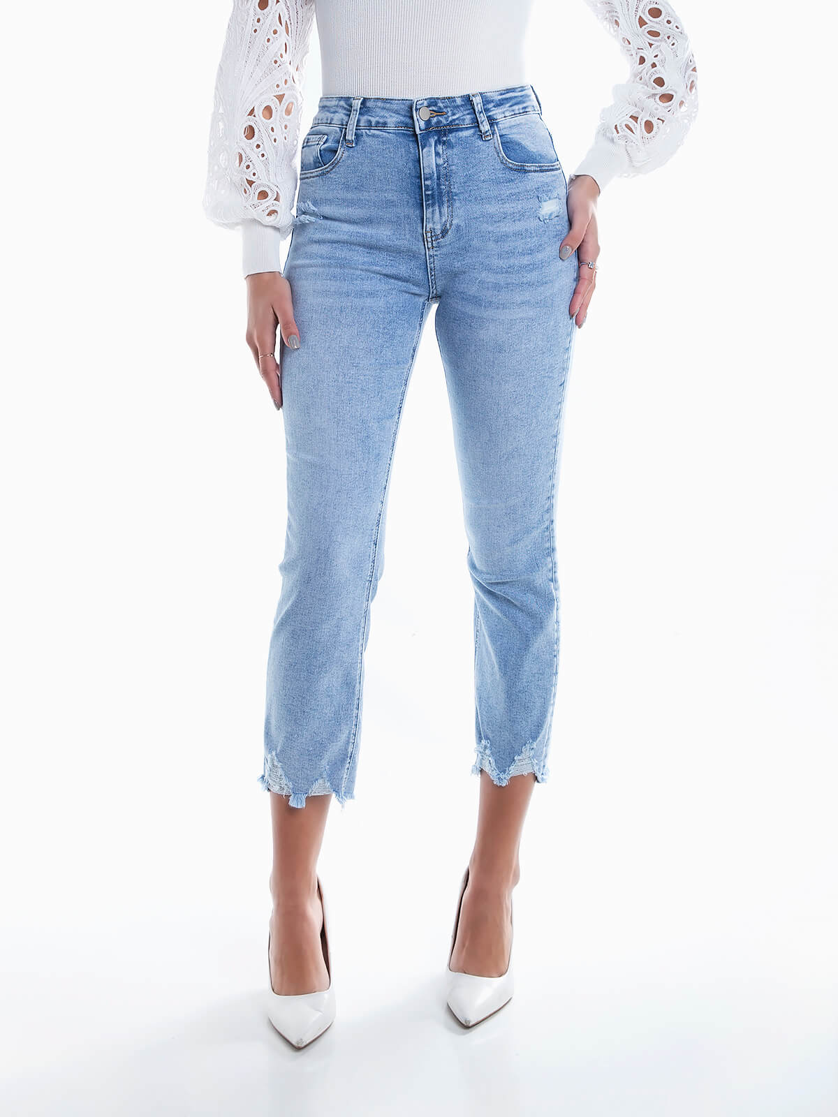 Calças de ganga com rasgos para senhora. Jeans elásticas de cintura alta com lavagem azul claro. Base desfiada. 5 bolsos. Aperto de fecho éclair e botão.