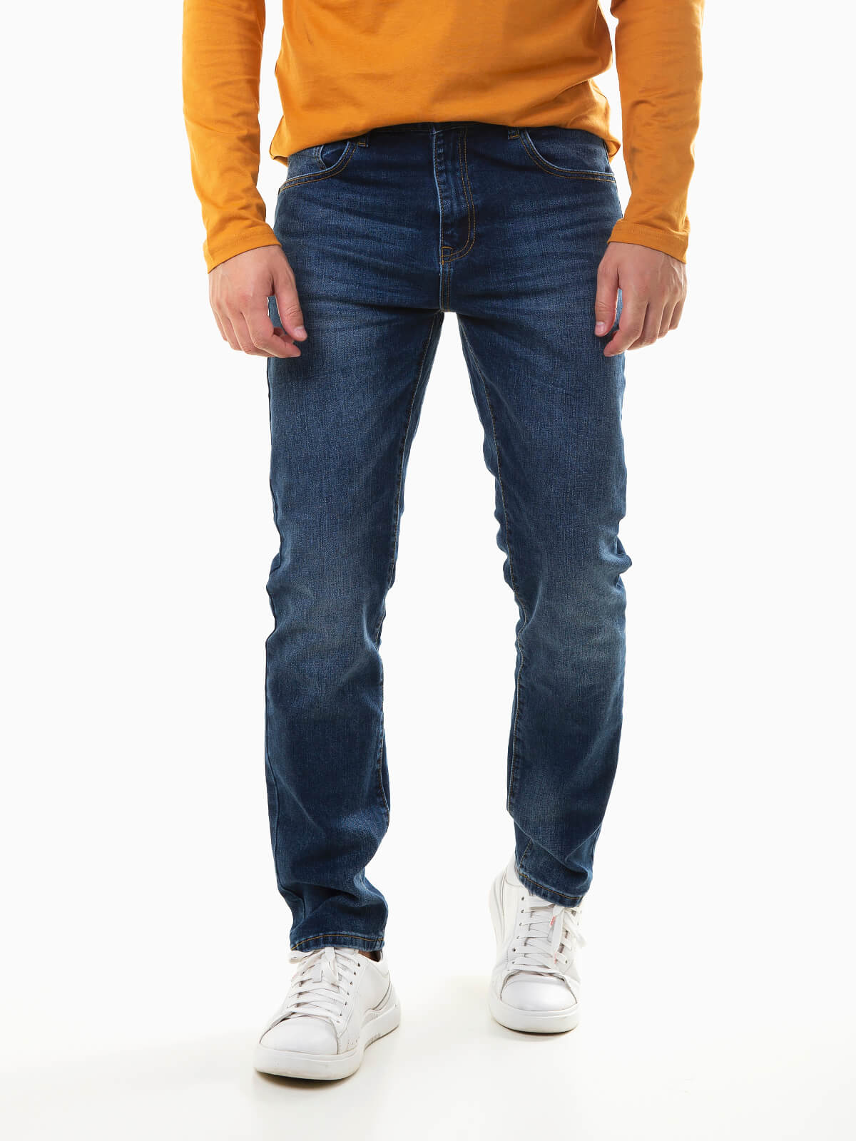 Calças ganga slim fit com lavagem azul escuro para homem. Jeans com 5 bolsos. Aperto fecho éclair e botão.