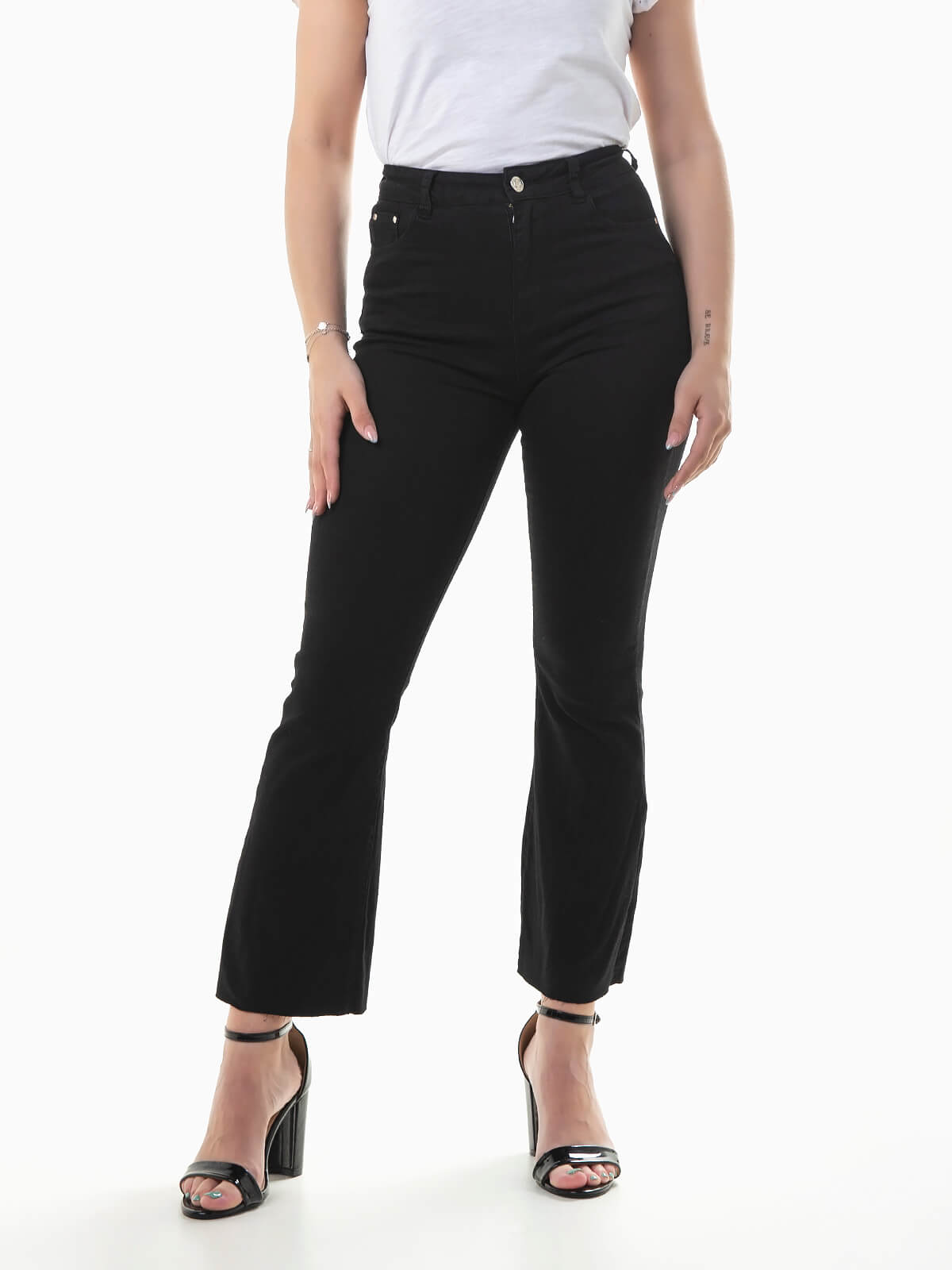 Calças de ganga curtas à boca de sino para senhora. Jeans elásticas de cintura alta elástica. 5 bolsos. Aperto fecho éclair e botão.