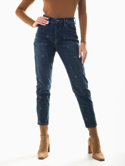 Calças de ganga com efeito push-up para senhora. Jeans de cintura alta com lavagem azul claro. 5 bolsos. Aperto de fecho éclair e botão.