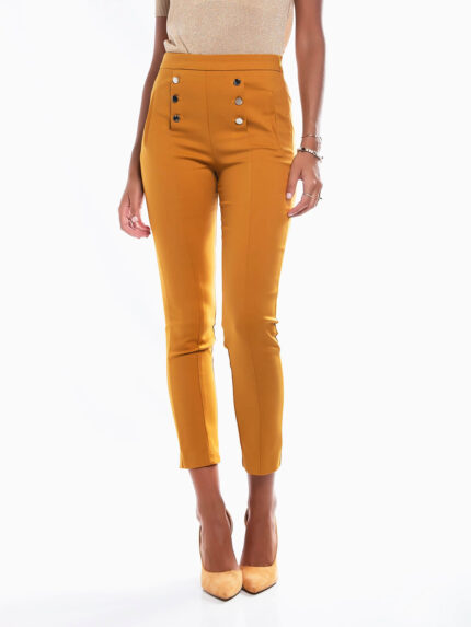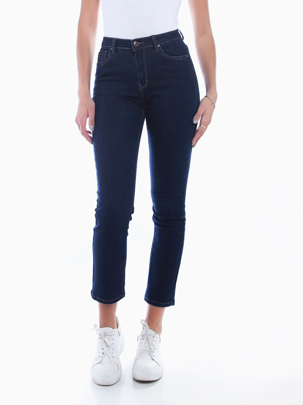 Calças de ganga elásticas de lavagem azul escuro. Jeans de cintura alta. 5 bolsos. Aperto fecho éclair e botão.