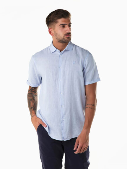 Calças de ganga skinny fit com lavagem azul médio para homem. Jeans elásticas com 5 bolsos. Aperto de fecho éclair e botão.