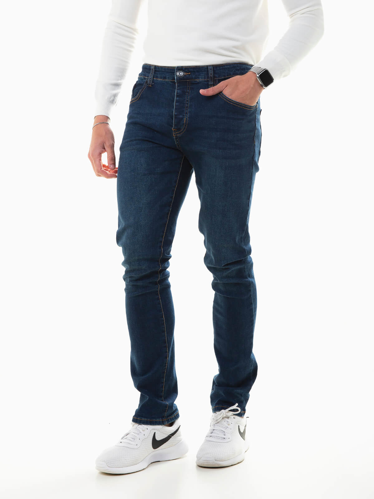 Calças de ganga elásticas com aperto de botões. Jeans para homem com lavagem azul escuro e 5 bolsos.
