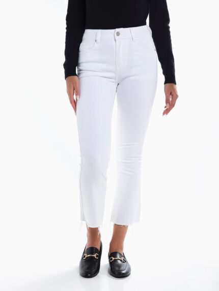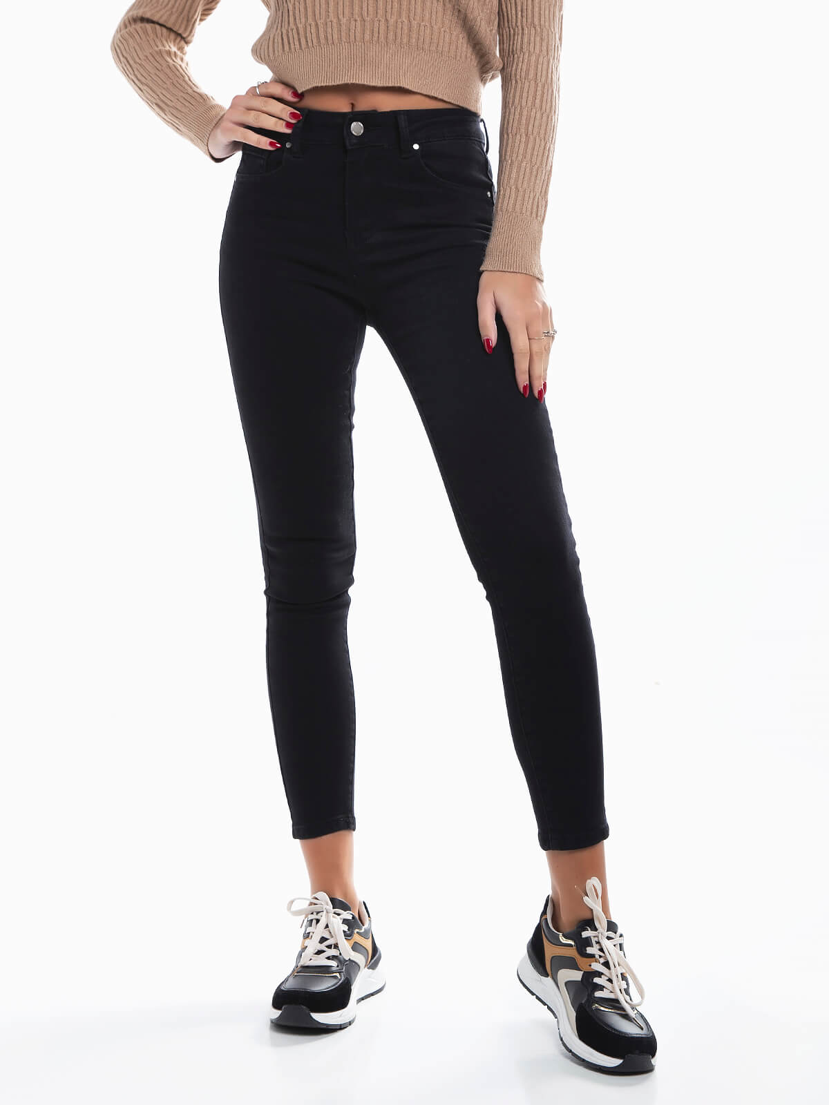 Calças ganga elásticas pretas para senhora. Jeans de cintura alta com 5 bolsos. Aperto fecho éclair e botão.