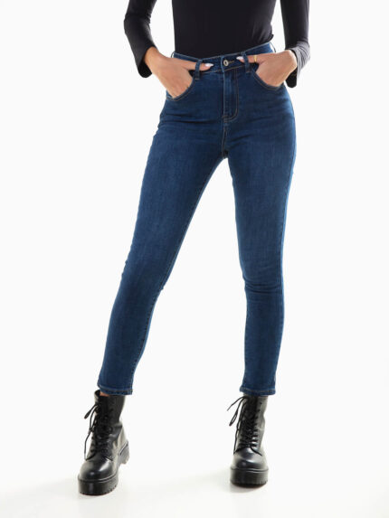 Calças de ganga elásticas com lavagem azul escuro para mulher. Skinny jeans de cintura alta com 5 bolsos. Aperto de fecho éclair e botão.