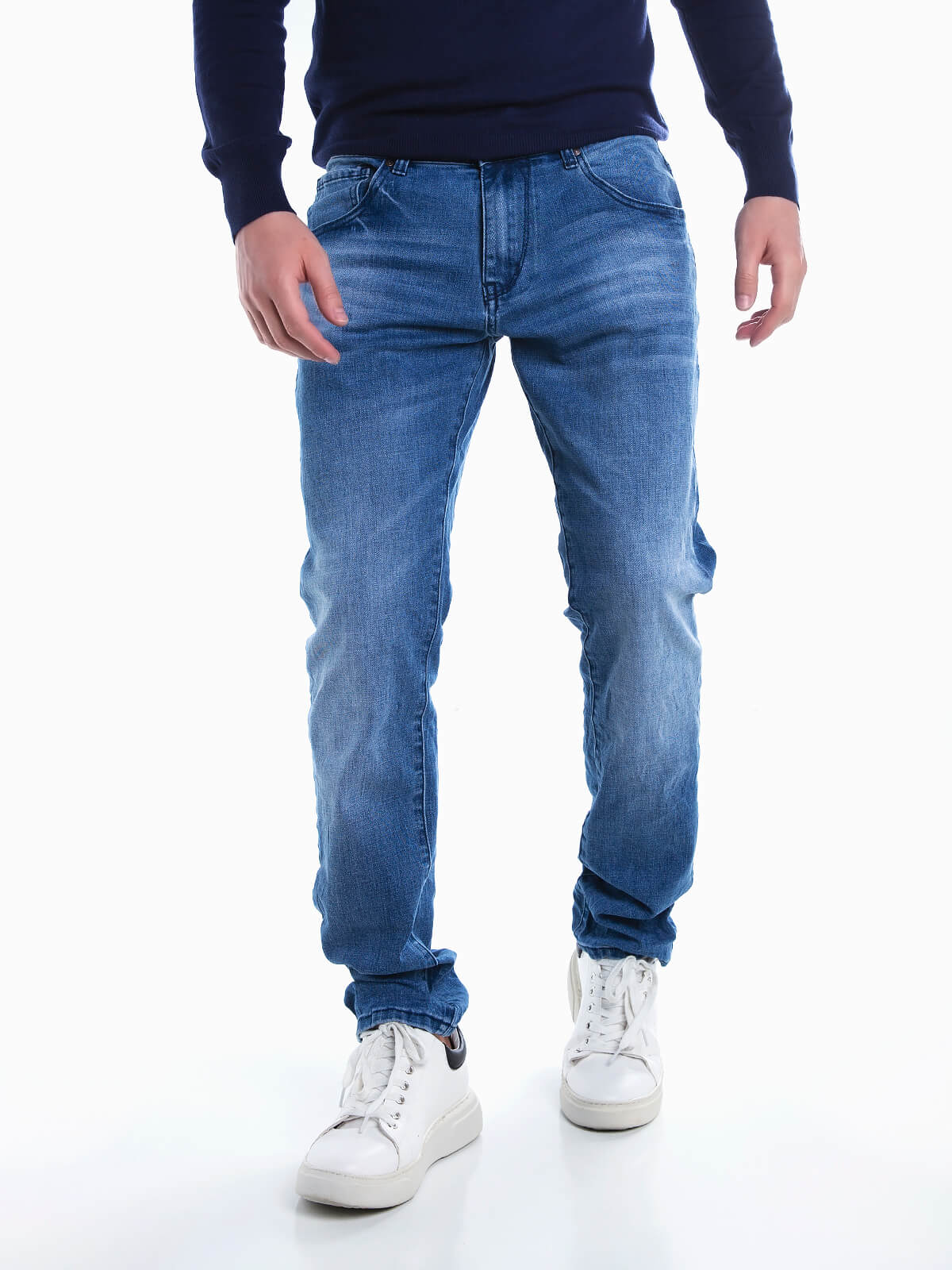 Calças de ganga elásticas slim fit para homem. Jeans com lavagem azul claro. 5 bolsos. Aperto de fecho éclair e botão.