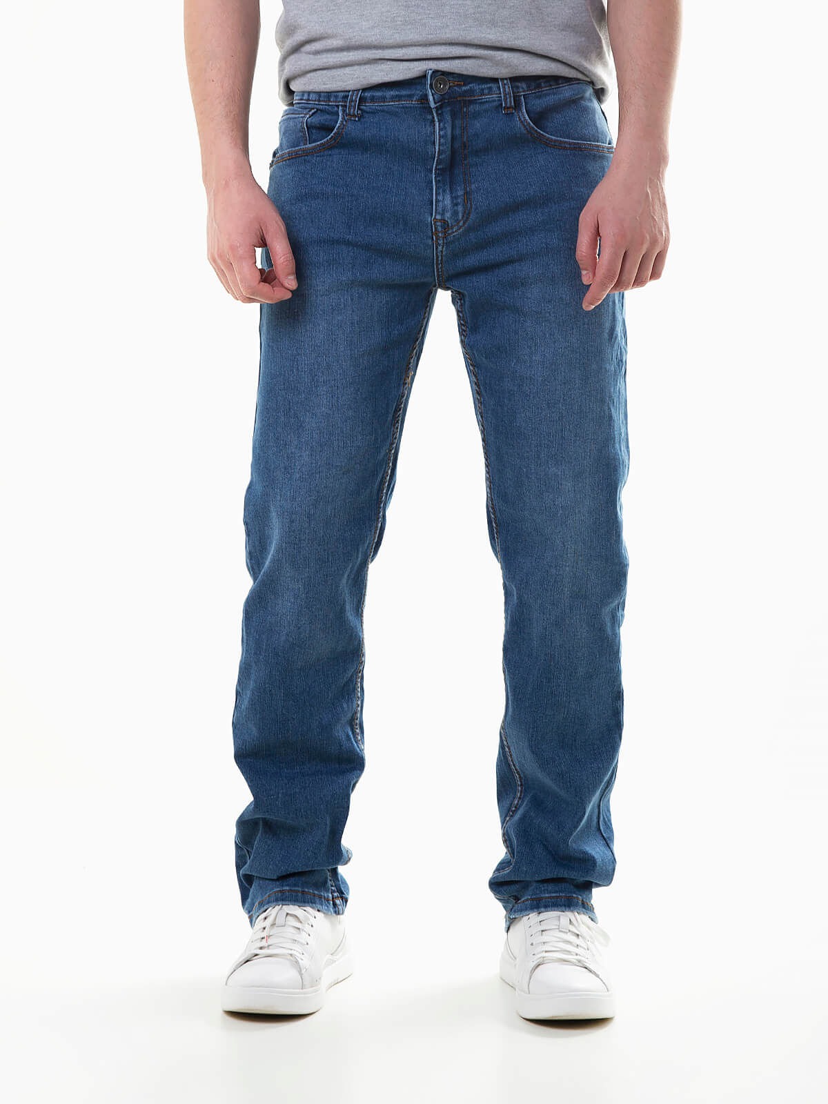 Calças ganga elásticas straight fit para homem. Jeans com lavagem azul claro. 5 bolsos. Aperto de fecho éclair e botão.