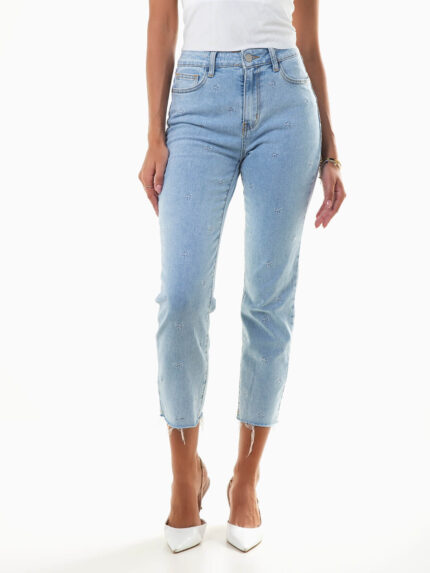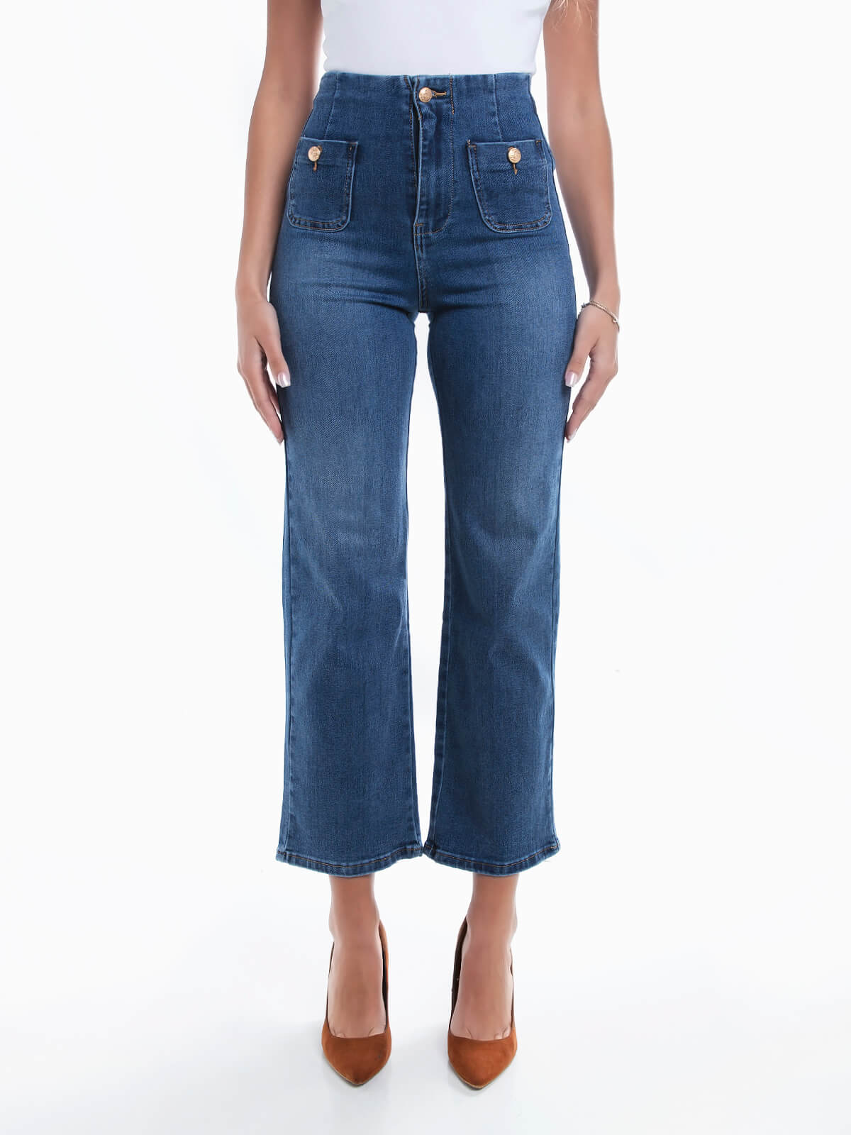 Calças de ganga elásticas wide leg para senhora. Jeans de cintura alta com lavagem azul escuro. 4 bolsos. Acerto de fecho éclair e botão.