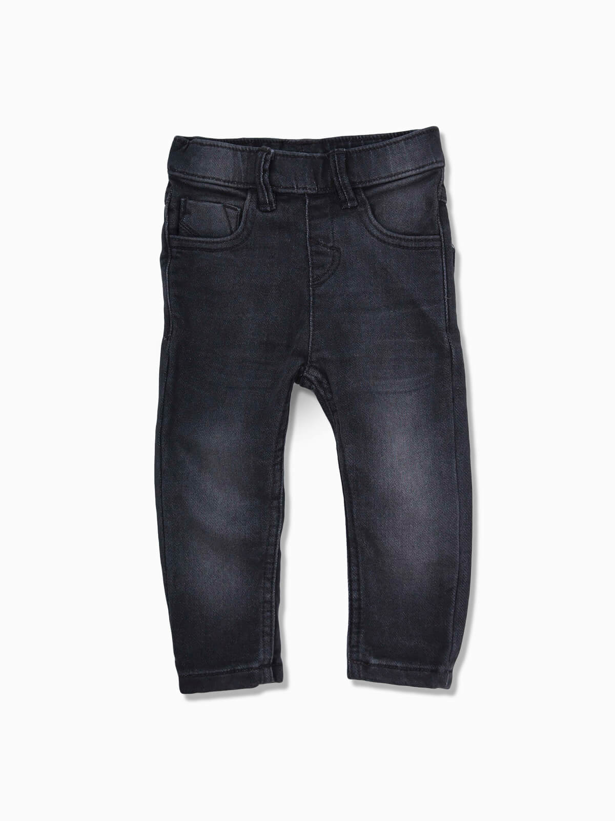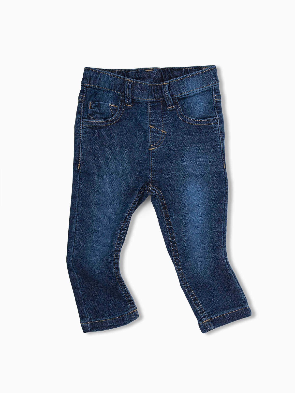 Calças ganga de lavagem azul claro para bebé menino. Calças elásticas com ajustador na cintura. 5 bolsos.