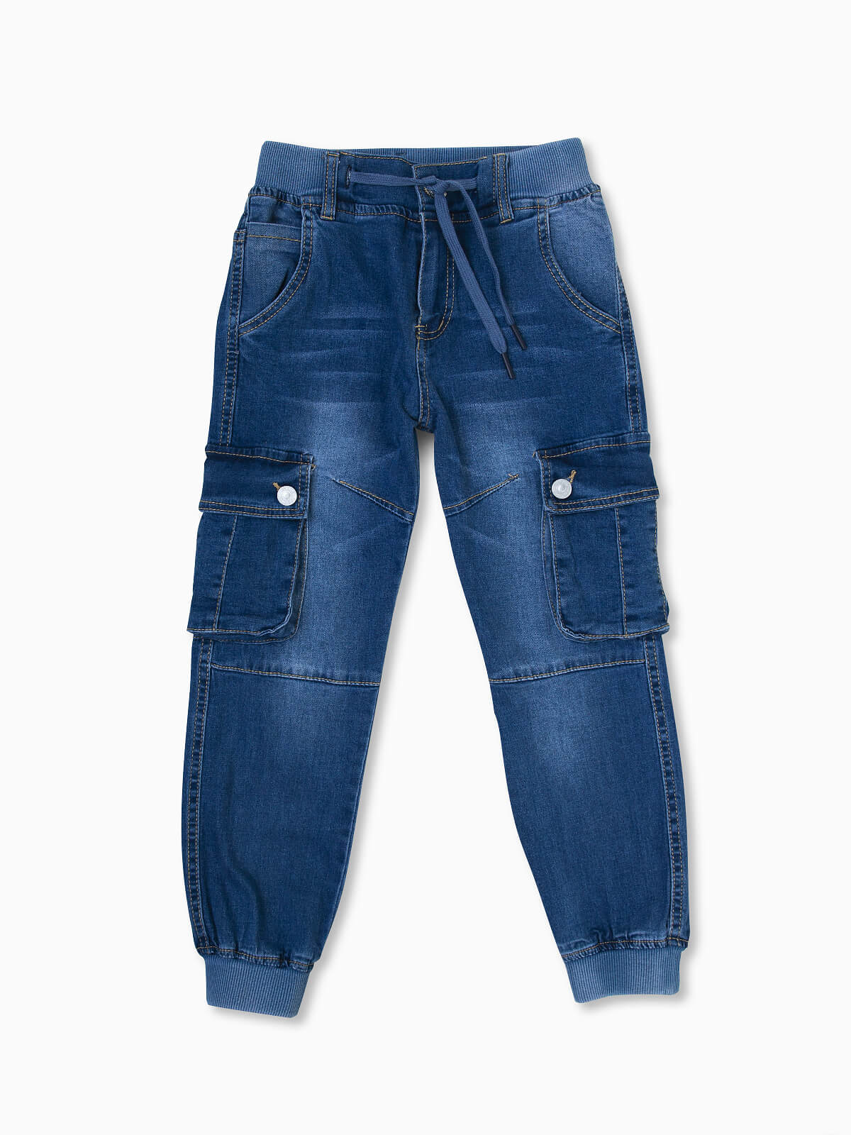Calças ganga estilo cargo para menina. Calças jogger com extremidades elásticas e cordão na cintura para ajustar. Lavagem azul escuro. 7 bolsos. Aperto de fecho zíper e botão.