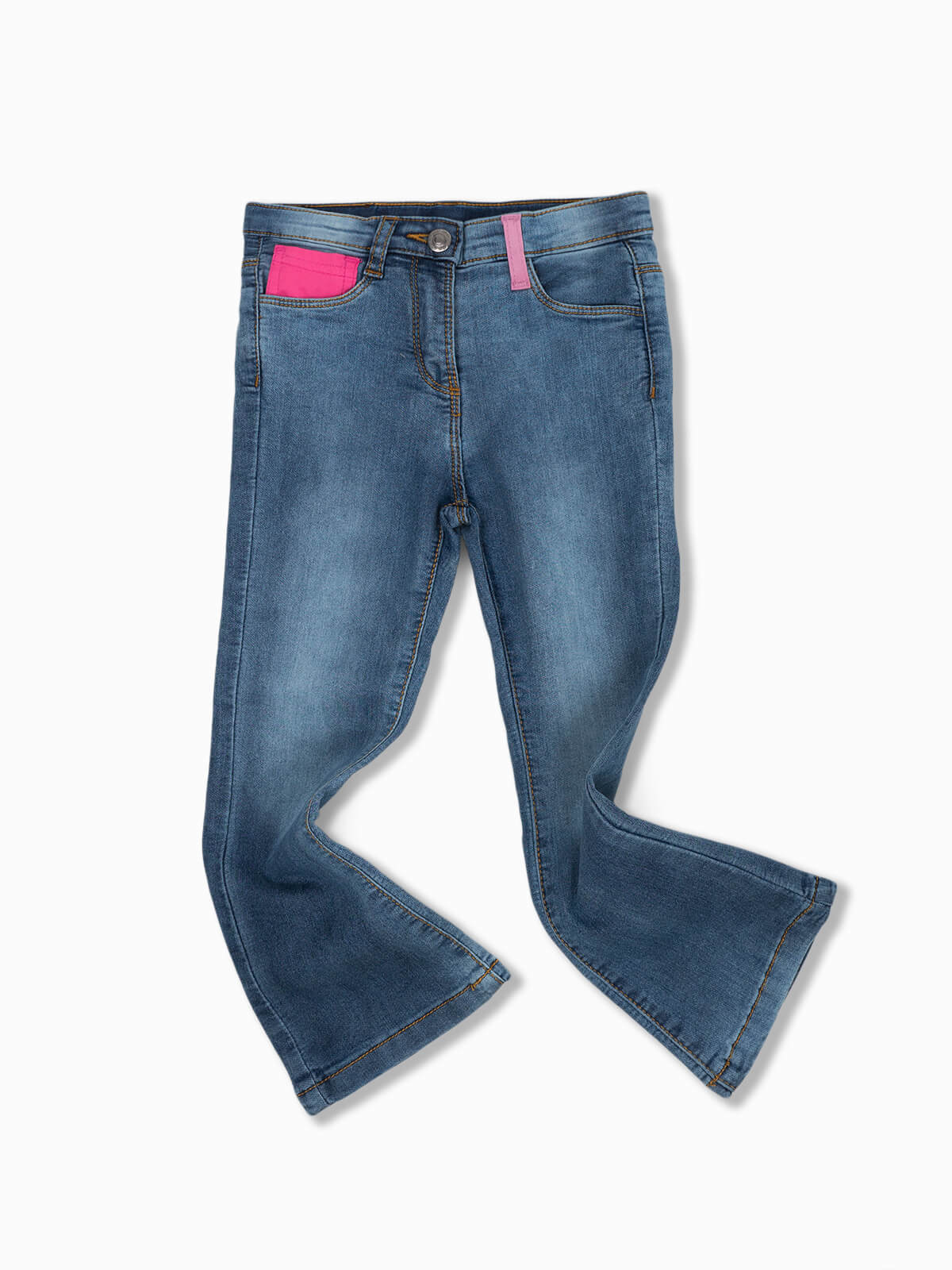 Calças ganga flare combinadas com bolsos em rosa. Jeans com lavagem azul claro e ajustador no interior. 5 bolsos. Aperto fecho éclair e botão.