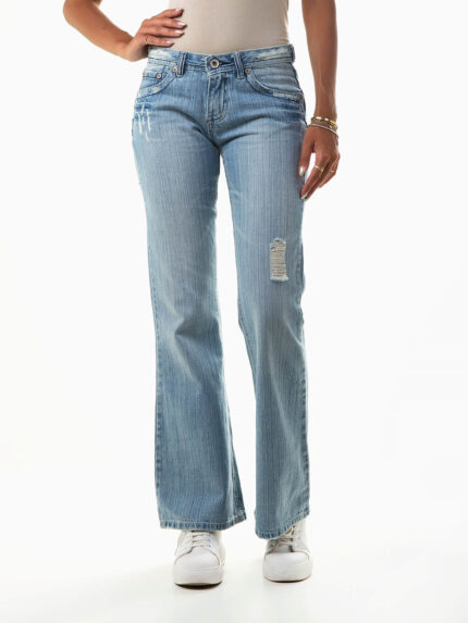 Calças ganga à boca de sino com lavagem azul escuro e pormenores de muito desgaste. Jeans de cintura baixa com aperto de 3 botões. Corrente removível.