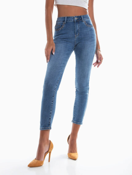 Calças de ganga pretas à boca de sino com costuras reforçadas à frente e pormenores laterais. Jeans de cintura alta com base desfiada e 5 bolsos. Aperto fecho éclair e botão.