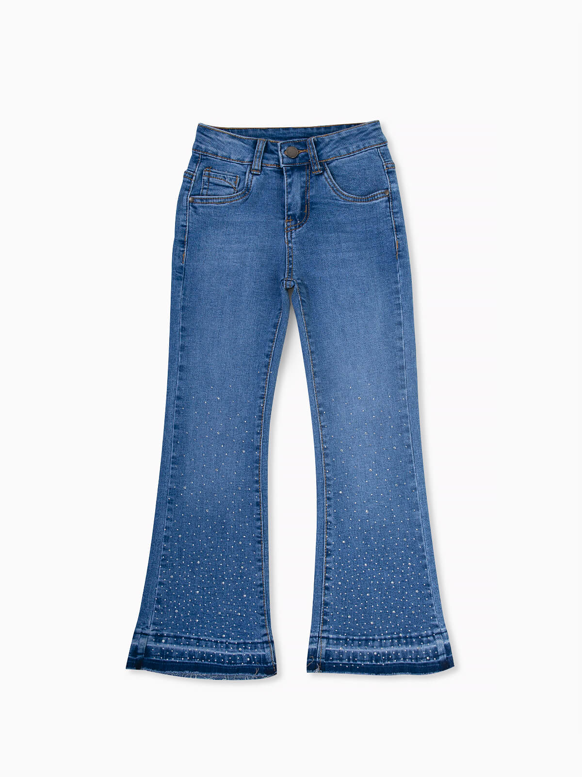 Calças ganga flare para menina com base desfiada. Jeans elásticas de lavagem azul claro com ajustador no interior. Aplicações brilhantes. 5 bolsos. Aperto fecho zíper e botão.